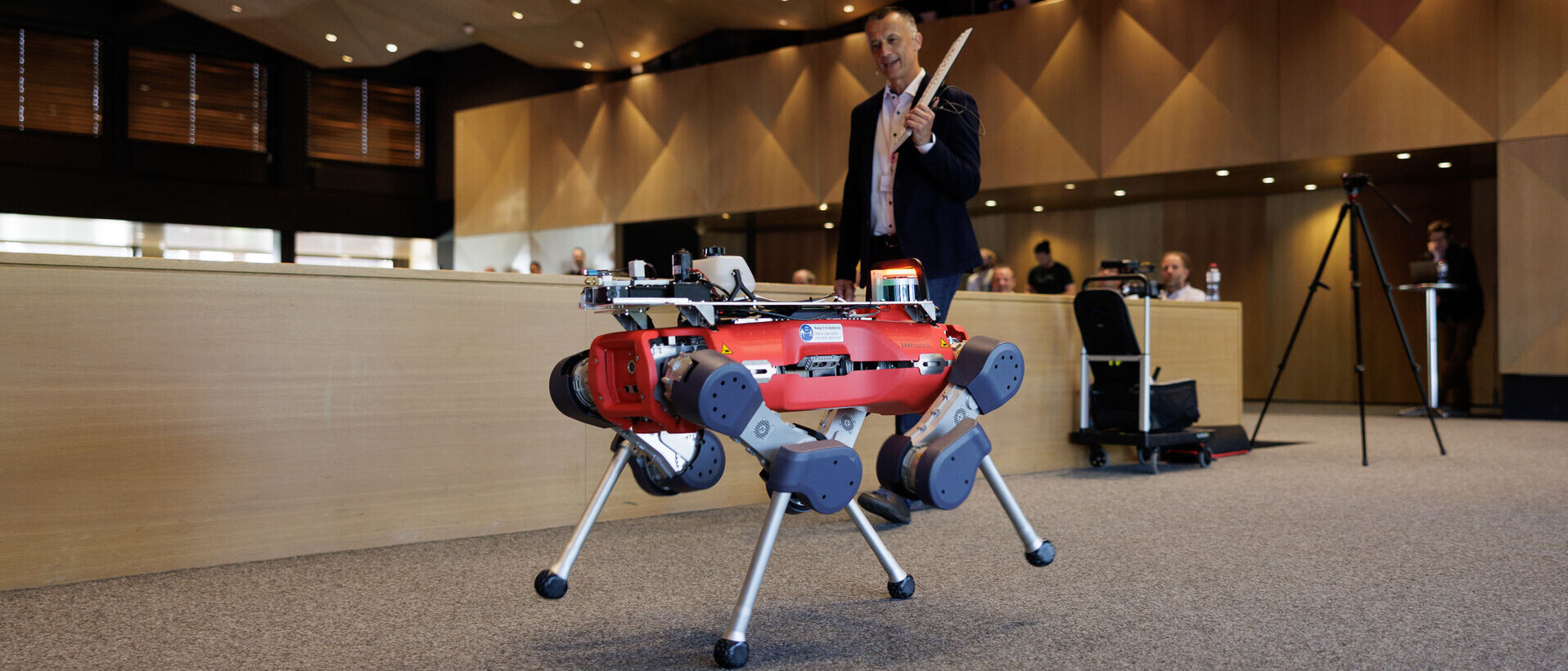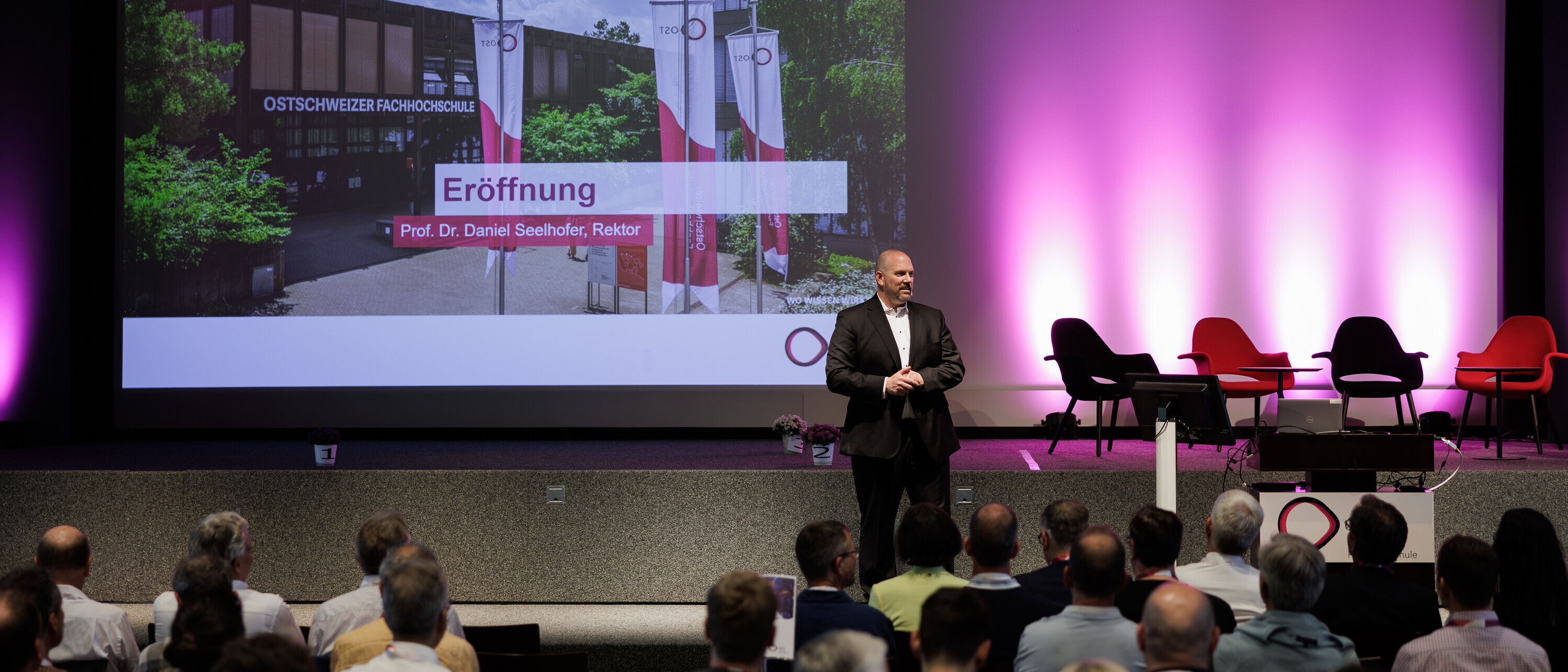 Rektor Daniel Seelhofer eröffnete den Anlass mit einem klaren Bekenntnis zur KI-Strategie der OST: «Unsere Rolle als Fachhochschule ist es, die Brücke zwischen Spitzenforschung und konkreter Anwendung von KI zu schlagen.» Über 20 Forschungsinstitute an der OST arbeiten mit KI, oft in enger Zusammenarbeit mit Unternehmen und Dienstleistern. Auch in der Lehre ist das Thema allgegenwärtig: Seit 2021 enthält jeder Studiengang KI-Inhalte. Unabhängig von der Fachrichtung sollen alle Studierenden lernen, welche Möglichkeiten die KI bietet und wie sie sich einsetzen lässt.