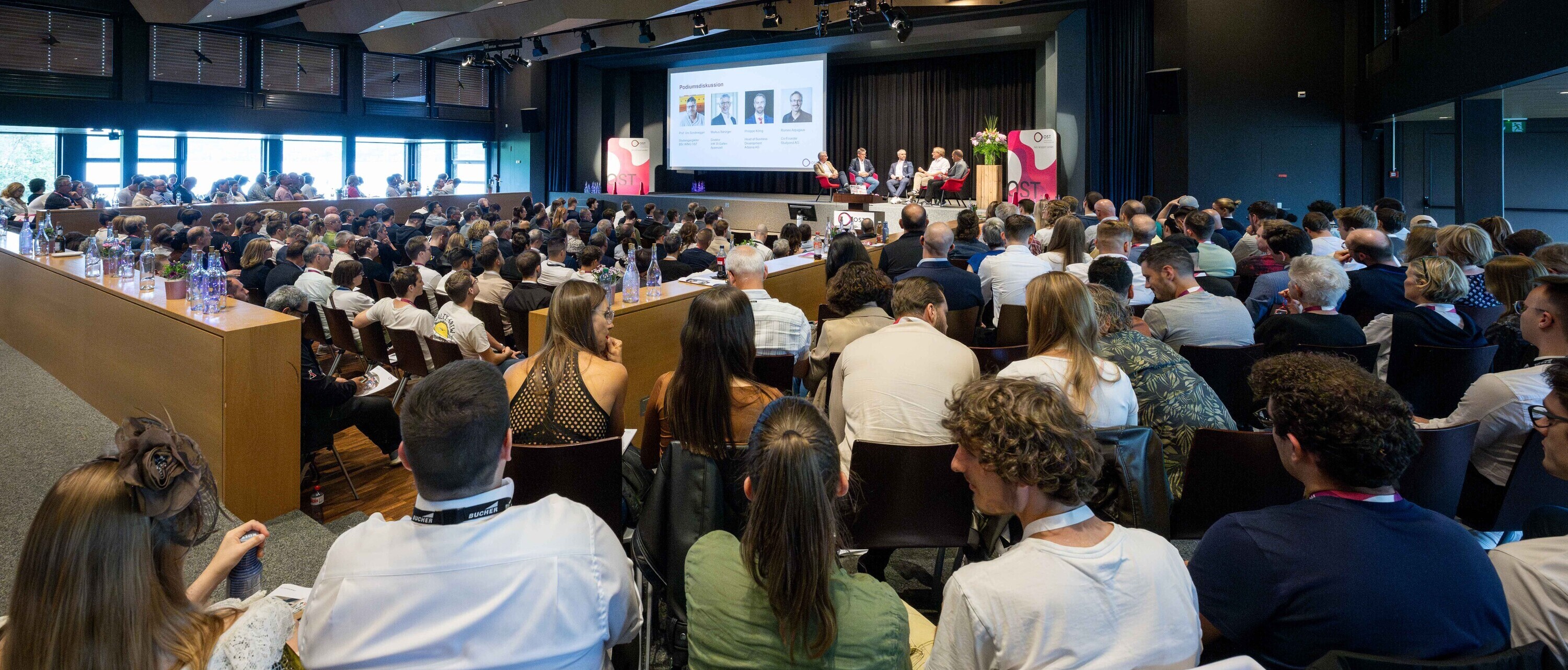 In einer Podiumsdiskussion betonten Vertreter aus Industrie und Wirtschaft den Mehrwert der Zusammenarbeit mit der OST. Romeo Arpagaus, Co-Founder der Studyond AG, hob die neue Denkweise und Tool-Kompetenz hervor, welche die neue Studierendengeneration der AI-Natives mitbringt. Philippe König, Head of Business Development bei der Arbonia AG, hat selbst ein Industrieprojekt begleitet. Die dort erarbeitete Lösung sei seit dem Go-Live erfolgreich im Einsatz. Markus Bänziger, Direktor der Industrie- und Handelskammer St.Gallen-Appenzell, unterstrich: «Die Studierenden der OST befruchten etablierte Teams mit aktuellem Fachwissen, frischen Perspektiven und anders gedachten Lösungsansätzen.»