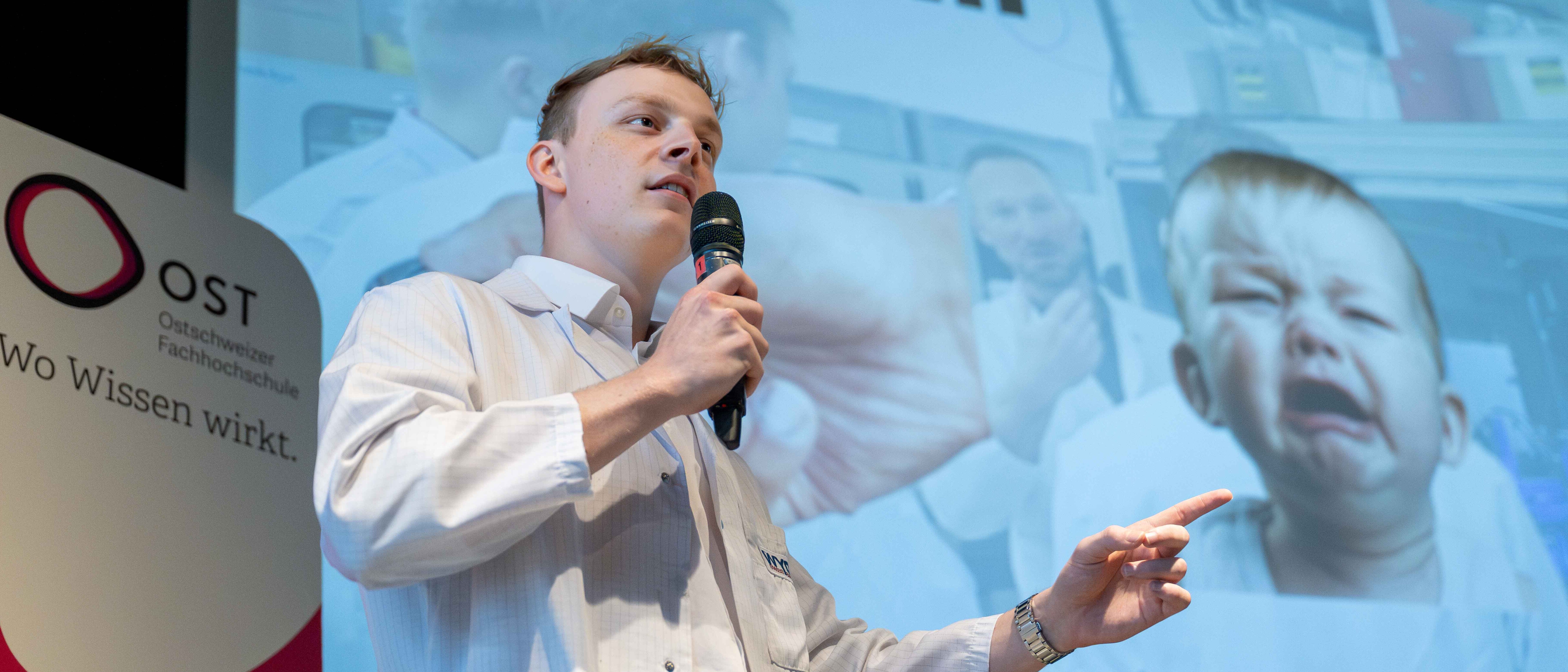 Nach einem Grusswort von Andreas Wälti, CEO des Technologieunternehmens Evatec, hatte jedes Studierendenteam drei Minuten Zeit, um sein Projekt zu pitchen. In einer Ausstellung konnten die Gäste danach die Protoypen besichtigen.