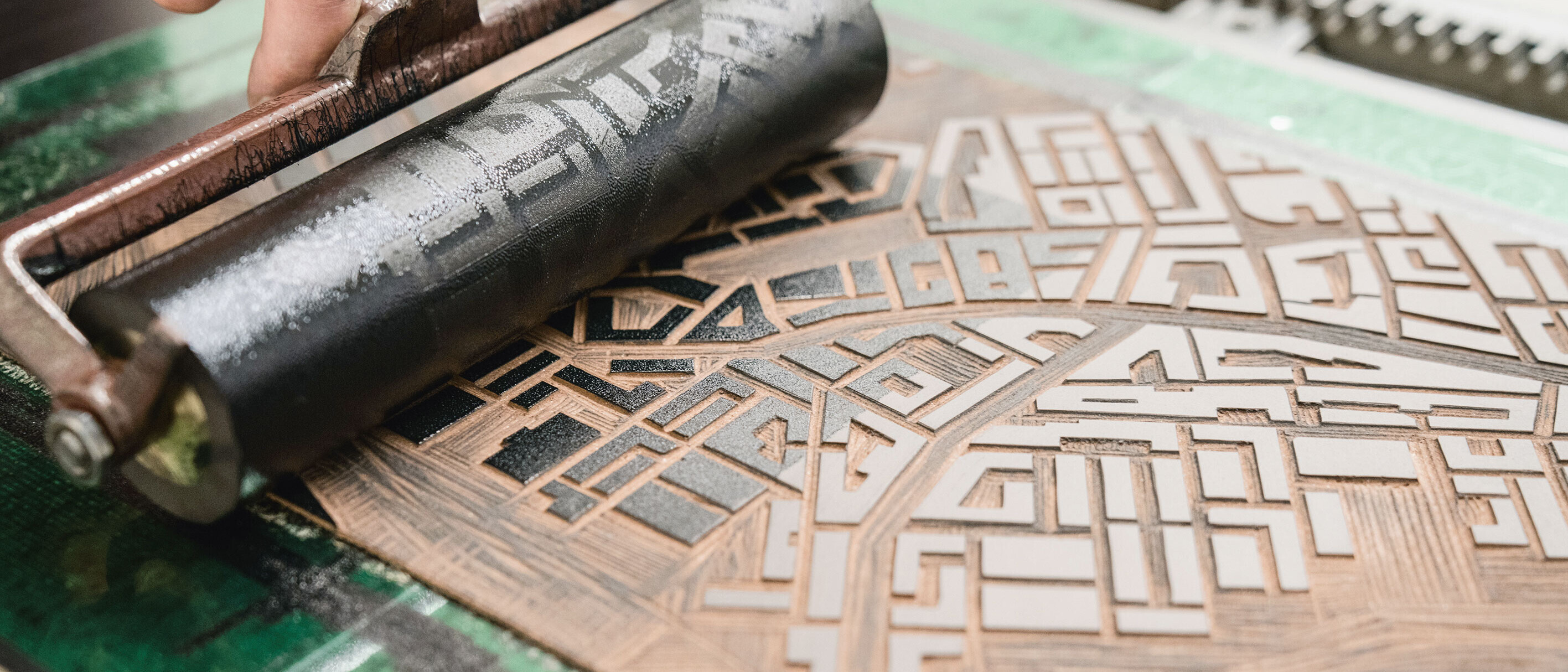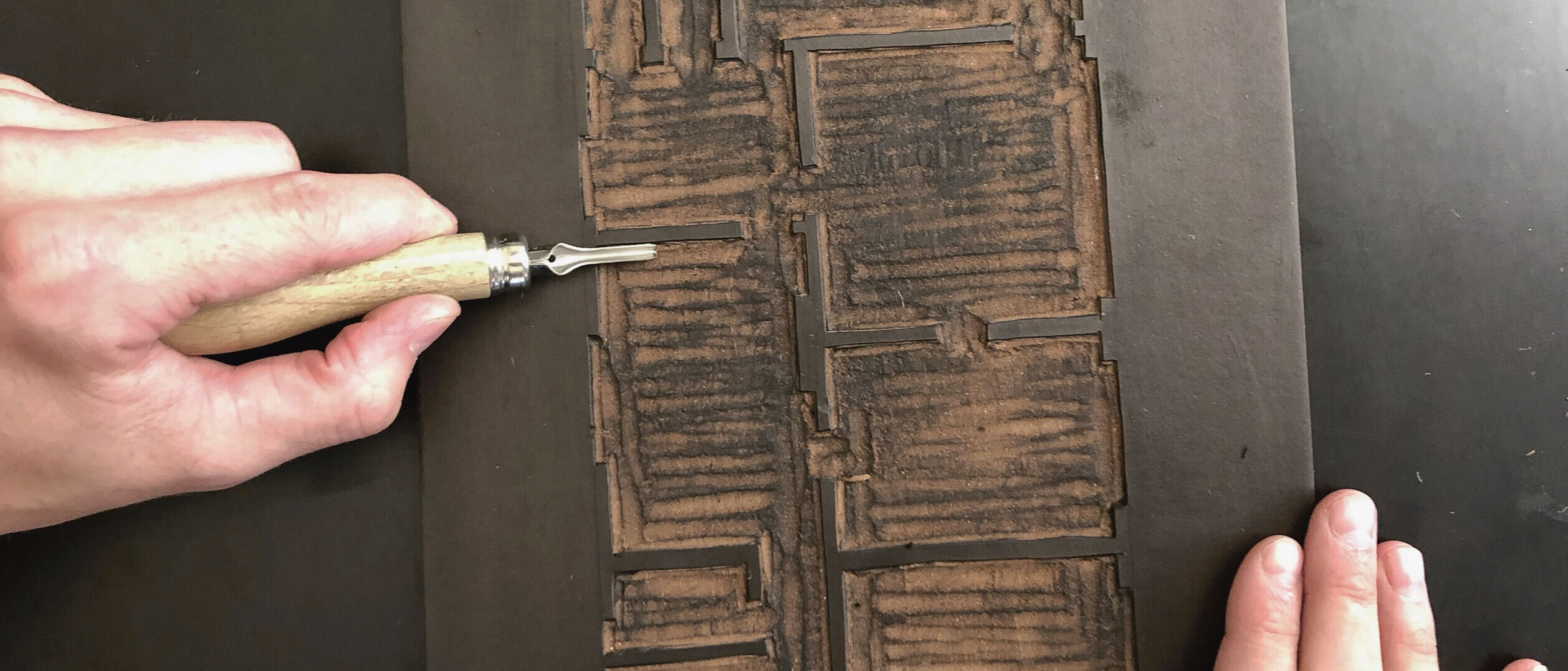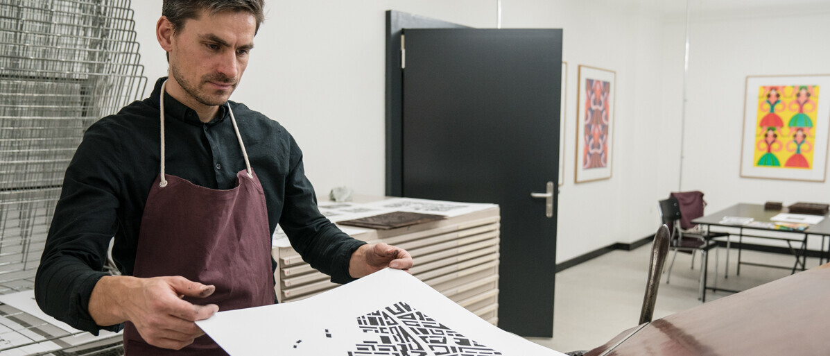 Zwei Druckerpressen für Hochdruckverfahren bilden das Herz der Druckwerkstatt. Hier werden vor allem Linolschnitte in Schwarzweiss oder Farbe hergestellt. Das Bearbeiten der Druckplatten führt die Studierenden anschaulich in die Thematik von Figur und Grund, Masse und Raum ein.