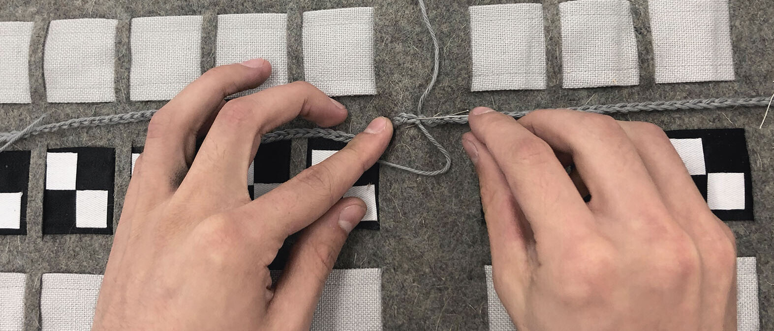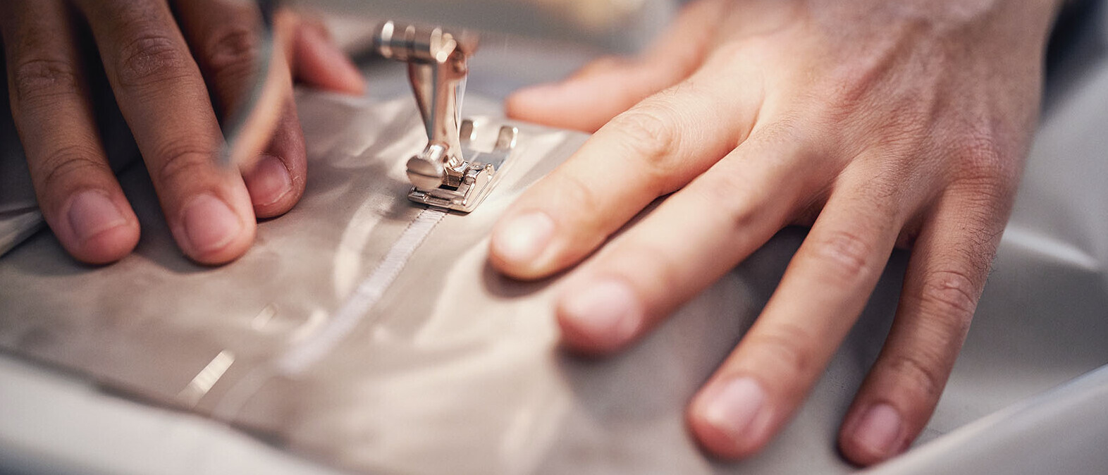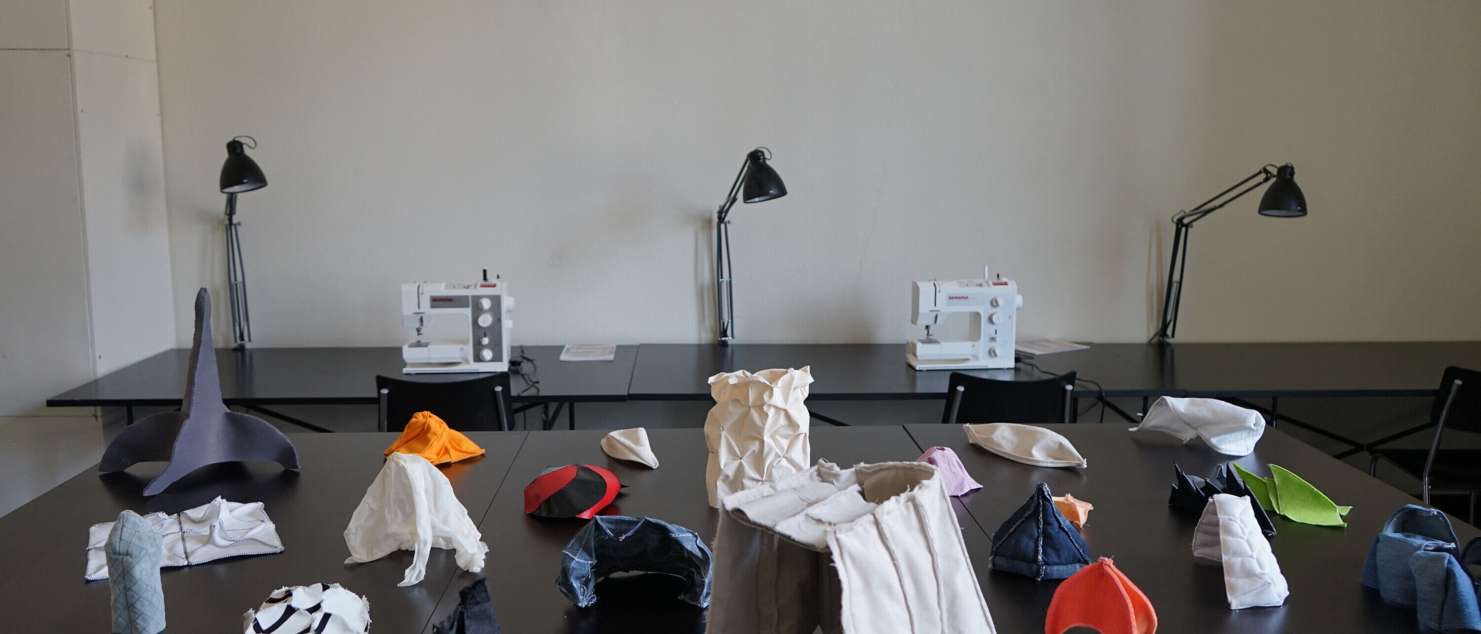 In der Textilwerkstatt surren die Nähmaschinen jeweils in der Gruppe – es wird aber auch still und leise von Hand genäht. Durch das gekonnte Zuschneiden und Zusammennähen fügen die Studierenden plane Stoffstücke zu räumlichen Gebilden zusammen.