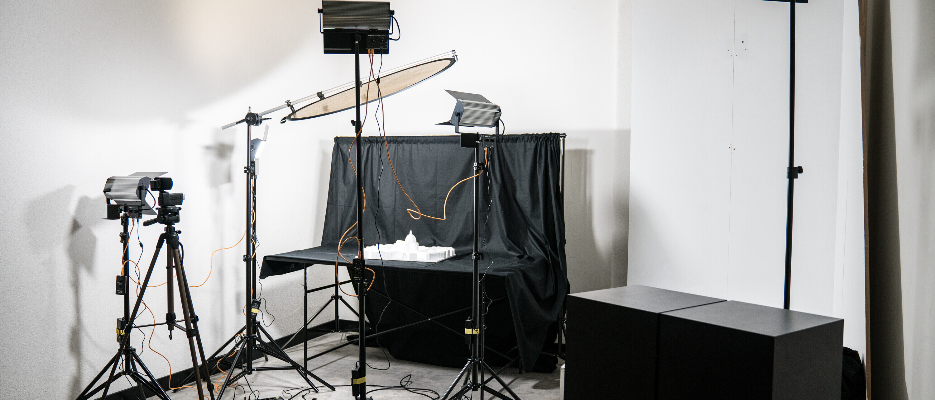 In der Fotowerkstatt können die Studierenden analoge Modelle und Objekte mit Hilfe von Beleuchtungseinrichtungen und Rollhintergründen semiprofessionell fotografieren. Die entstandenen Aufnahmen können in der Digitalwerkstatt weiterbearbeitet und mit anderen Darstellungstechniken kombiniert werden.