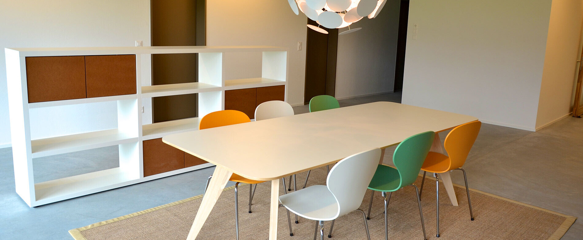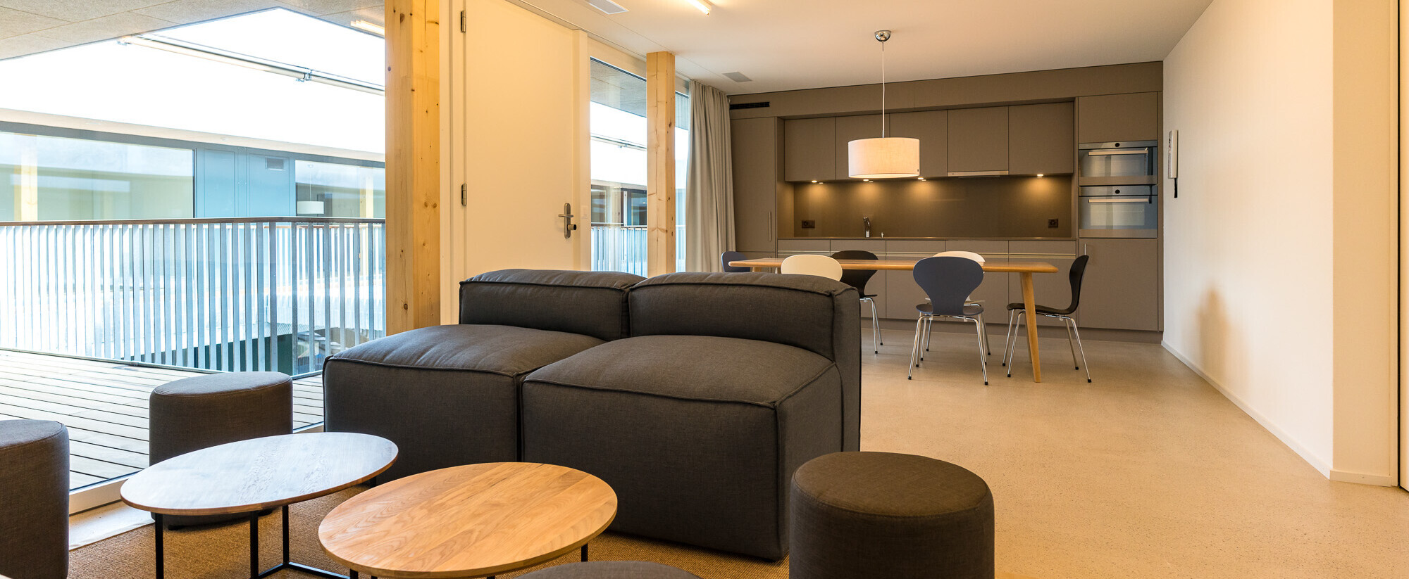 Jede Wohngruppe hat einen eigenen Balkon und eine grosszügige Küche mit Aufenthaltsbereich. Die Nasszellen in den Wohngruppen mit Dusche und Toilette teilen sich jeweils zwei bis drei Personen.
