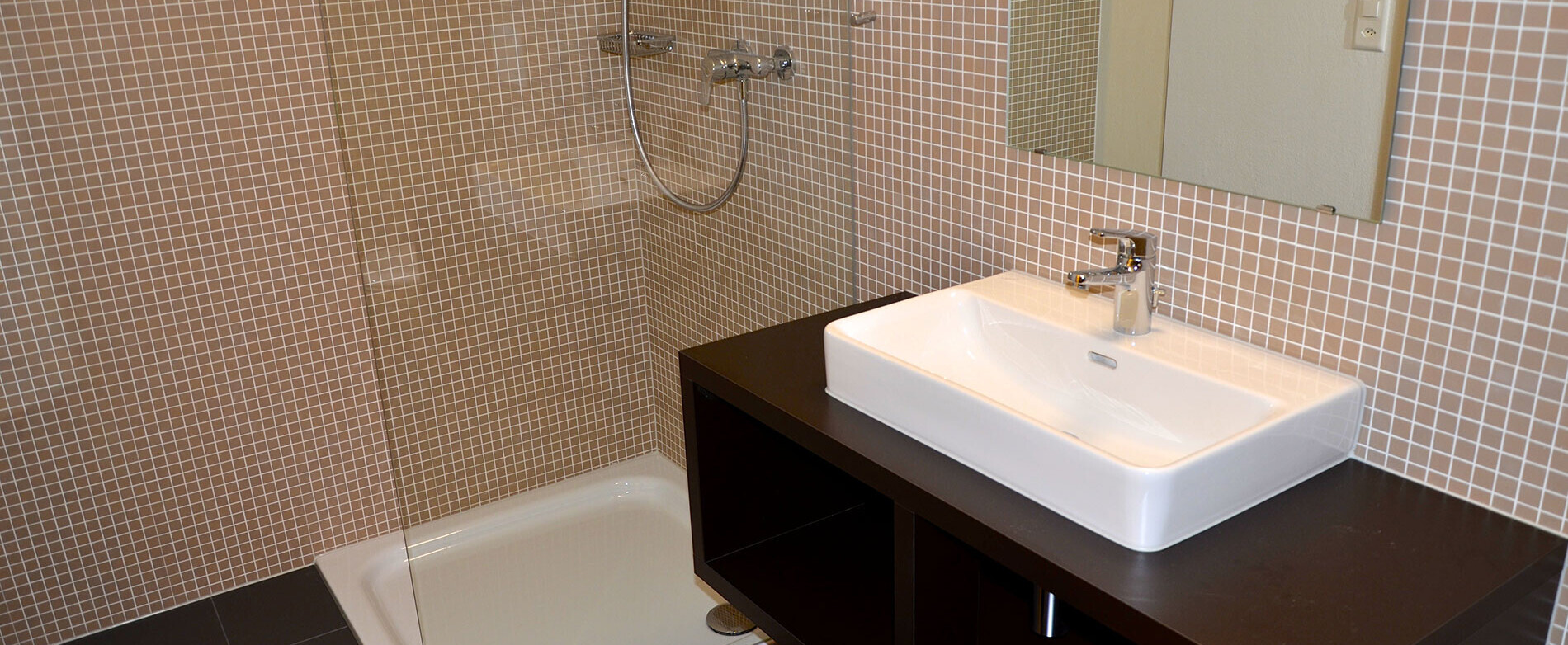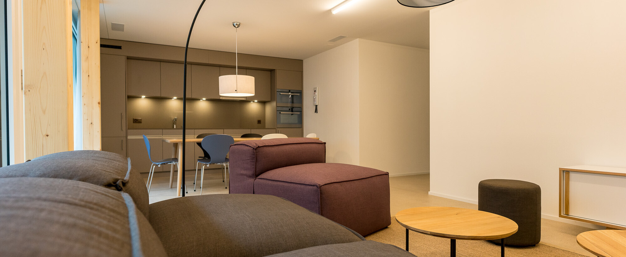 Im Erdgeschoss des Studentenwohnheims befinden sich die sieben Studios mit separater Nasszelle und gemeinsamer Küche sowie drei 3-er Wohngruppen.