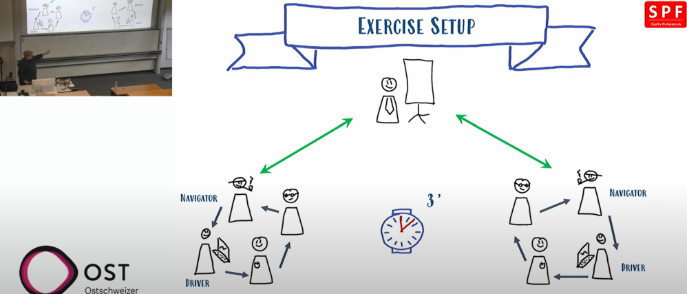 Unterstützt wurde er dabei von Danilo Biella, Agile und Quality Professional bei SPF Consulting, der Mob Programming bzw. Mob Prompting (MobAI) einführte. Mob Programming ist eine agile Entwicklungsmethode, bei der gemeinsam an einem einzigen Rechner gearbeitet wird, jedoch nicht nur zu zweit (Pair Programming), sondern im gesamten Team, um Code kollaborativ zu erstellen, Entscheidungen im Kollektiv zu treffen und sofort Feedback einzuholen. Es fördert den interaktiven Unterricht und verteilt das Wissen unter den Beteiligten.