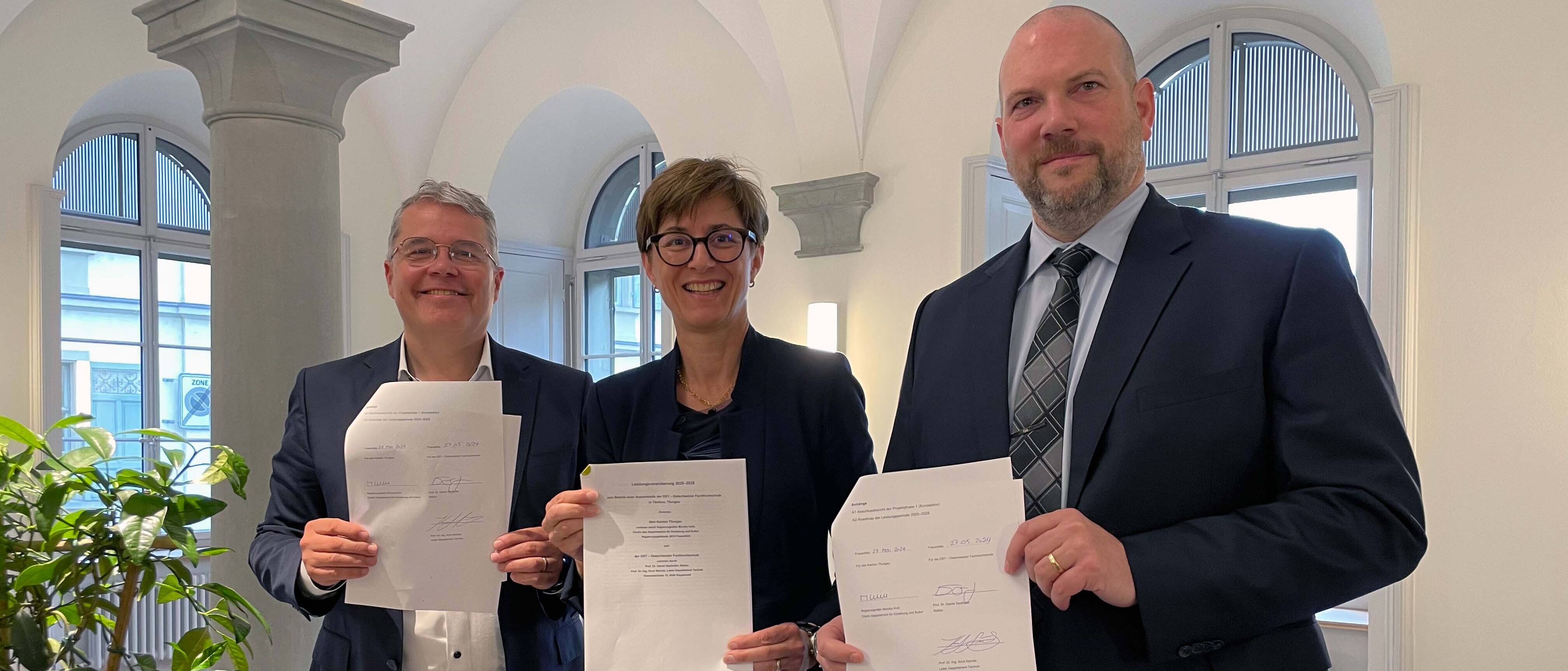 Heute Montag wurde eine mehrjährige Leistungsvereinbarung zwischen dem Kanton Thurgau, vertreten durch Regierungsrätin Monika Knill, Chefin des Departementes für Erziehung und Kultur, und der OST, repräsentiert durch Rektor Prof. Dr. Daniel Seelhofer und den Leiter des Departements Technik, Prof. Dr. Knut Siercks, unterzeichnet. Die Vereinbarung regelt den Betrieb des neuen Instituts für Intelligente Systeme und Smart Farming der Land- und Ernährungswirtschaft (ISF) der OST am Standort Tänikon im Auftrag des Kantons Thurgau für die erste Phase von 2025 bis 2028. Diese Vereinbarung markiert einen entscheidenden Schritt zur nachhaltigen Förderung der Hochschulaktivitäten im Bereich der innovativen Land- und Ernährungswirtschaft im Kanton Thurgau. Die OST gründet in Tänikon ein Institut und schafft damit neue Forschungsarbeitsplätze im Kanton. «Das neue Institut der OST stärkt den interdisziplinären Forschungsstandort Tänikon und verleiht ihm zusätzliche Strahlkraft für die Schweiz und über ihre Grenzen hinaus», sagt Monika Knill. Bei der Unterzeichnung war auch Regierungsrat Walter Schönholzer, Chef des Departementes für Inneres und Volkswirtschaft, anwesend, was die Bedeutung der neuen Hochschulkooperation für den Kanton Thurgau unterstreicht.