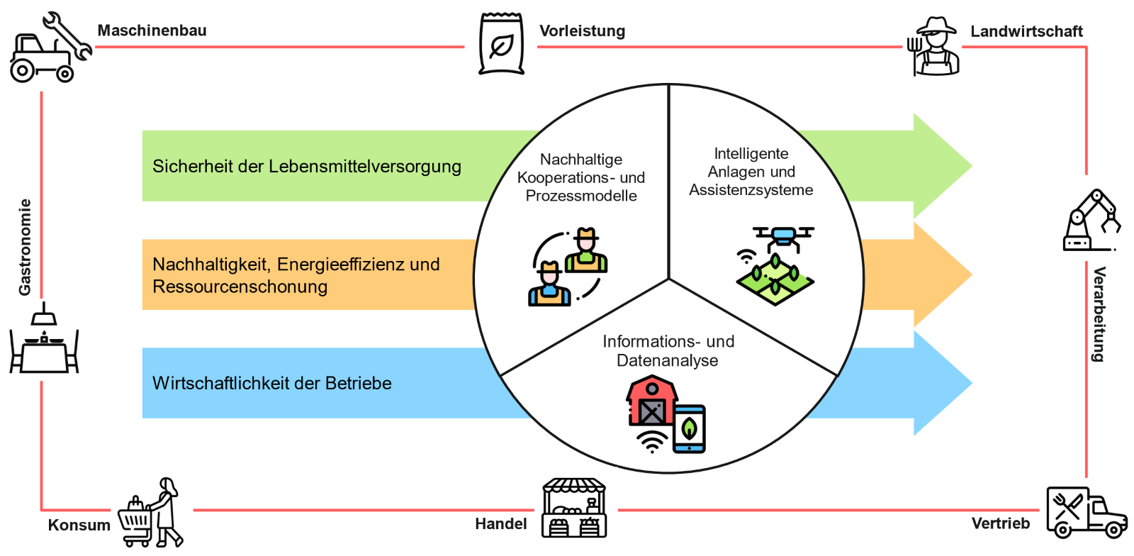 Um die gemeinsamen Ziele zu erreichen, verfolgen der Kanton Thurgau und die OST klare Stossrichtungen, die auf den drei strategischen Handlungsfeldern «Sicherheit der Lebensmittelversorgung», «Wirtschaftlichkeit der Betriebe» und «Nachhaltigkeit, Energieeffizienz und Ressourcenschonung» basieren. Ergänzt werden sie durch drei Fokusthemen: «nachhaltige Kooperations- und Prozessmodelle», «Informations- und Datenanalyse», sowie «intelligente Anlagen und Assistenzsysteme».