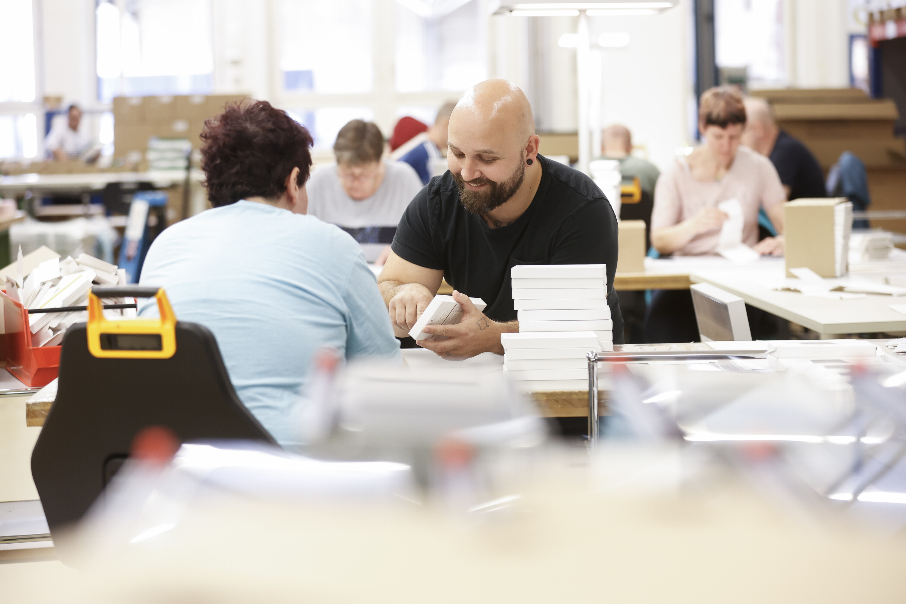 Es rattert, hämmert, klirrt und knallt in der geschützten Werkstatt in Winterthur. Dazwischen werden Begrüssungen ausgetauscht und Kaffee getrunken. Der Arbeitsagoge Krenar Jones Schibli zeigt, mit was seine Mitarbeitenden momentan beschäftigt sind. Obwohl erst Anfang September ist und die Sommerhitze noch allen den Schweiss ins Gesicht treibt, werden hier schon Dreikönigskuchen-Säckchen für einen Detailhändler sortiert. Es fange immer wie früher an, bemerkt Jones Schibli mit einem breiten Grinsen.
