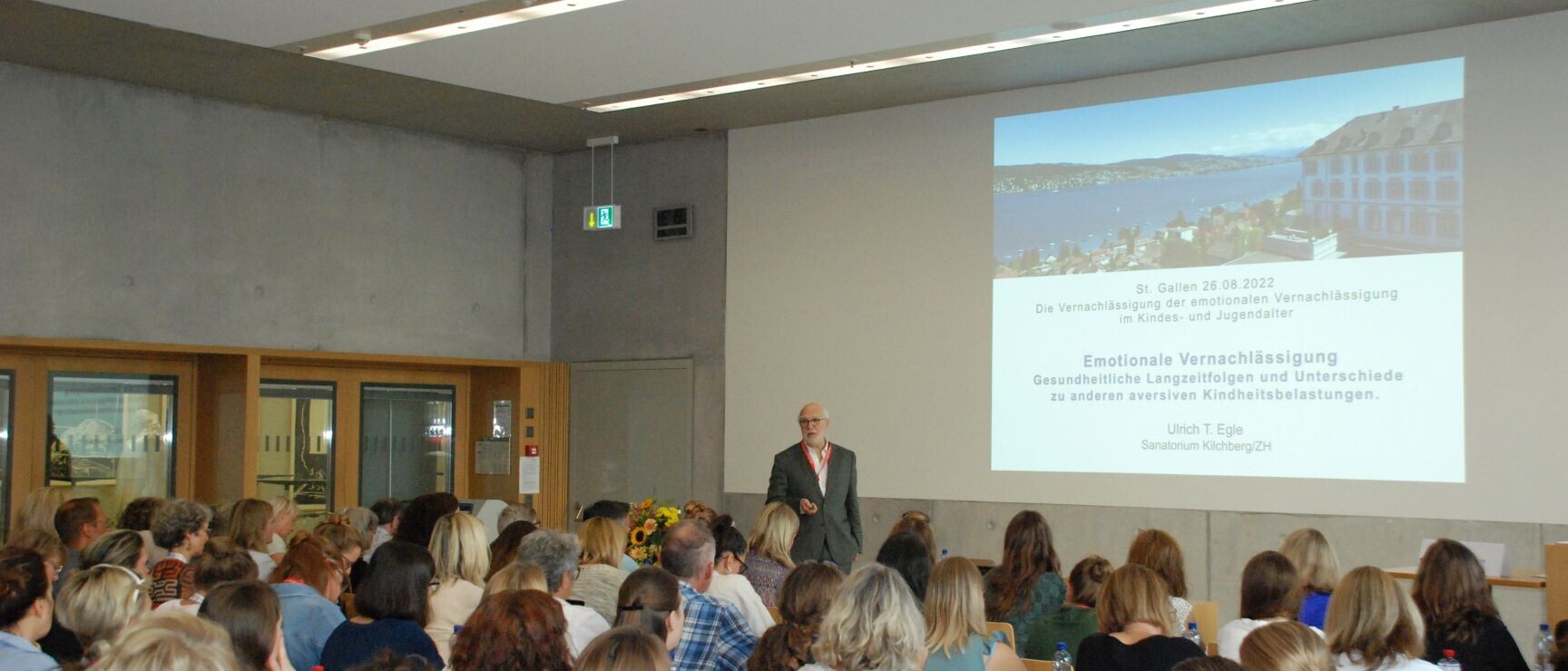 Das Programm eröffnet Prof. Dr. Ulrich T. Egle, Facharzt für Psychosomatische Medizin und Psychotherapie. In seinem Vortrag erklärt der Mediziner, wie sich emotionale Vernachlässigung aus neurobiologischer Sicht darstellt. Gleich zu Beginn macht er klar: «Emotionale Vernachlässigung zeigt sich neurobiologisch in anderer Form als eine körperliche Gewalterfahrung oder sexueller Missbrauch in der Kindheit. Deshalb hat sie auch andere Konsequenzen für die Behandlung.» Bei emotional vernachlässigten Kindern sei die Lernfähigkeit massiv eingeschränkt. Sie müssten mit starken kognitiven Einschränkungen leben. Als Folge zeigen sich bei Erwachsenen oftmals emotionale Störungen wie Angstsymptome oder Depressionen, Bindungsprobleme oder eine schlechtere Verarbeitung von Stress.