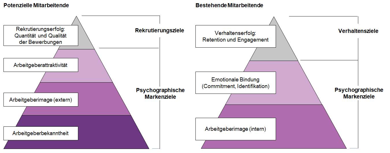 Grundsätzlich richtet sich Employer Branding an potenzielle und bestehende Mitarbeitende. Gemäss der Zielpyramide von von Walter und Kremmel (2016b, siehe Abbildung) ist das oberste Ziel in Hinblick auf potenzielle Mitarbeitende die Steigerung des Rekrutierungserfolgs. Dabei ist zwischen der Quantität und der Qualität von Bewerbungen zu unterscheiden. Aus Markensicht wird der Rekrutierungserfolg durch das Erreichen psychografischer Markenziele positiv beeinflusst (Collins & Kanar, 2014). Man unterscheidet zwischen Arbeitgeberattraktivität, Arbeitgeberimage und Arbeitgeberbekanntheit (von Walter & Kremmel, 2016b). Während unter Arbeitgeberattraktivität die generell empfundene Attraktivität einer Organisation als Arbeitgeber verstanden wird, bezieht sich das Arbeitgeberimage auf die Wahrnehmung und Beurteilung einzelner Arbeitgebereigenschaften. Das Arbeitgeberimage umfasst sowohl „instrumentelle“ Arbeitgebereigenschaften (z. B. Karrieremöglichkeiten, Vereinbarkeit von Familie und Beruf) als auch „symbolische“ Eigenschaften, die die Unternehmenskultur betreffen (z. B. innovativ, bodenständig). Grundlegende Voraussetzung für den Aufbau von Arbeitgeberimages ist wiederum eine ausreichende Bekanntheit als Arbeitgeber. Ist ein Arbeitgeber unbekannt, können potenzielle Mitarbeitende ihm keine Arbeitgebereigenschaften zuschreiben.