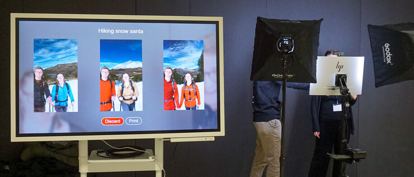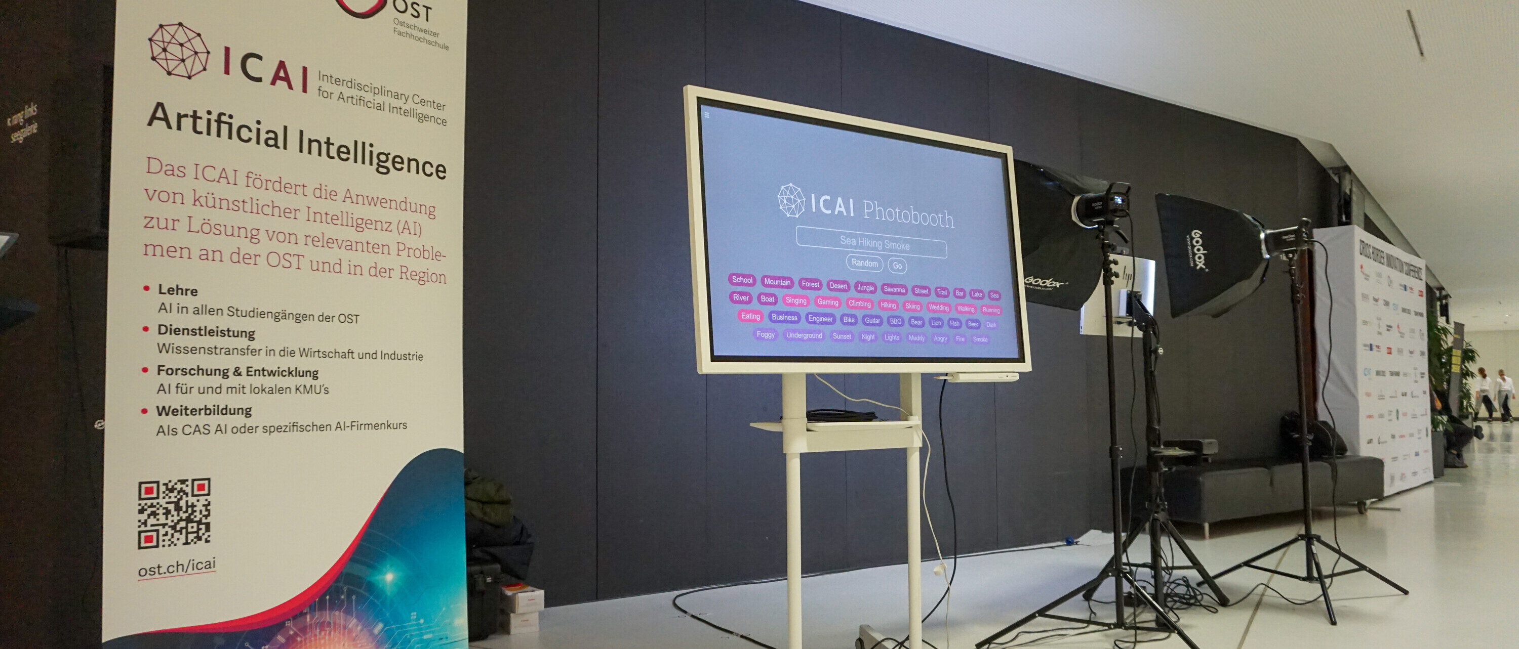 Ein Publikumshit war die AI-Photobooth des ICAI. «In der Photobooth kann man alle möglichen Begriffe eingeben, wie zum Beispiel Urwald, Hochzeit und Feuer. Die Photobooth macht dann ein Bild des Gesichts, schneidet es aus und fügt es in einen Hintergrund ein, der mit Hilfe von Künstlicher Intelligenz auf Basis der Begriffe generiert wird», erklärt Florian Baumgartner, Wissenschaftlicher Assistent am ICAI.
