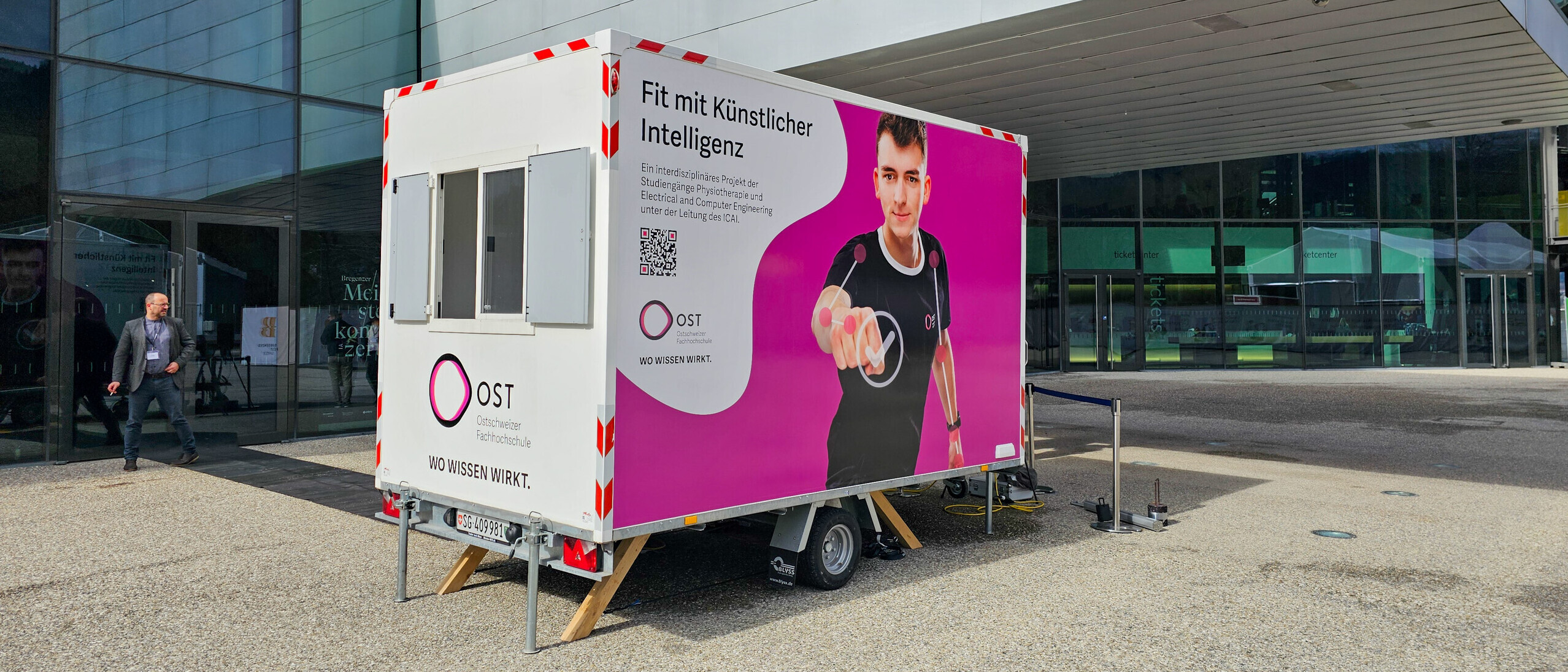 Mit Sport verbindet das ICAI auch ein neues Forschungsprojekt, das gemeinsam mit den Rapperswil-Jona Lakers und der OST-Physiotherapie durchgeführt wird. Guido Schuster und Selvin Blöchlinger, Wissenschaftlicher Assistent am ICAI, führten den Teilnehmenden der Konferenz ein neues und innovatives Trainingssystem vor. Dieses soll die sogenannten Exekutivfunktionen (EF) des Gehirns trainieren. Die Exekutivfunktionen sind jene Fähigkeiten des Menschen, die das eigene Denken und Handeln steuern. «Das Executive Function Training (EFT) dient dazu, unter psychischer und körperlicher Belastung schnell die richtigen Entscheidungen treffen zu können. Spitzensportlerinnen und -sportler können damit ihre Leistung verbessern», erklärt Selvin Blöchlinger. Zurzeit arbeitet das ICAI mit den Rapperswil-Jona Lakers zusammen, um zu schauen, wie sich ihre Fähigkeiten im Eishockey durch das Training verbessern. Das System befindet sich in einem Anhänger und kann dadurch zu den Sportlerinnen und Sportlern transportiert werden.