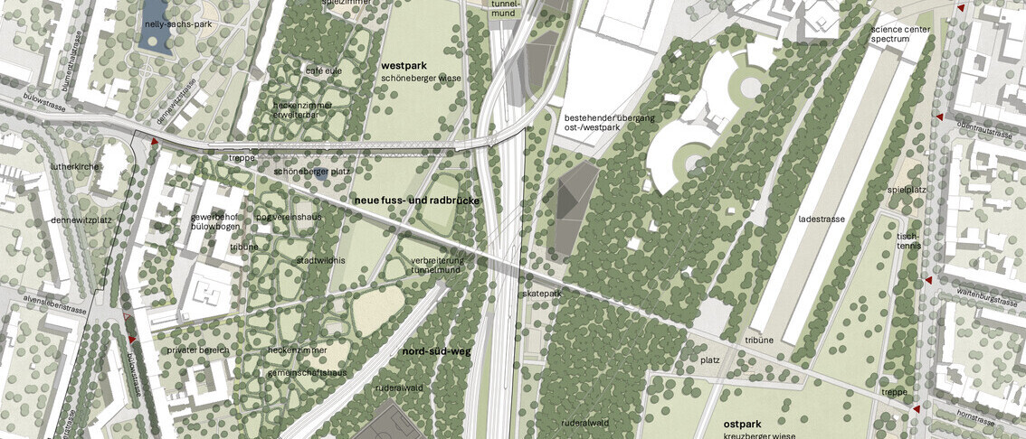 Unter dem Titel «Clever aufgegleist» lud der Architekten- und Ingenieurverein zu Berlin-Brandenburg (AIV) dazu ein, die bestehenden Planungen der Berliner S-Bahnlinie S21 zu überdenken. In der Fachsparte Landschaftsarchitektur galt es, eine sinnfällige Erweiterung des Parks am Gleisdreieck unter Eingliederung der neuen Bahntrasse zu planen.