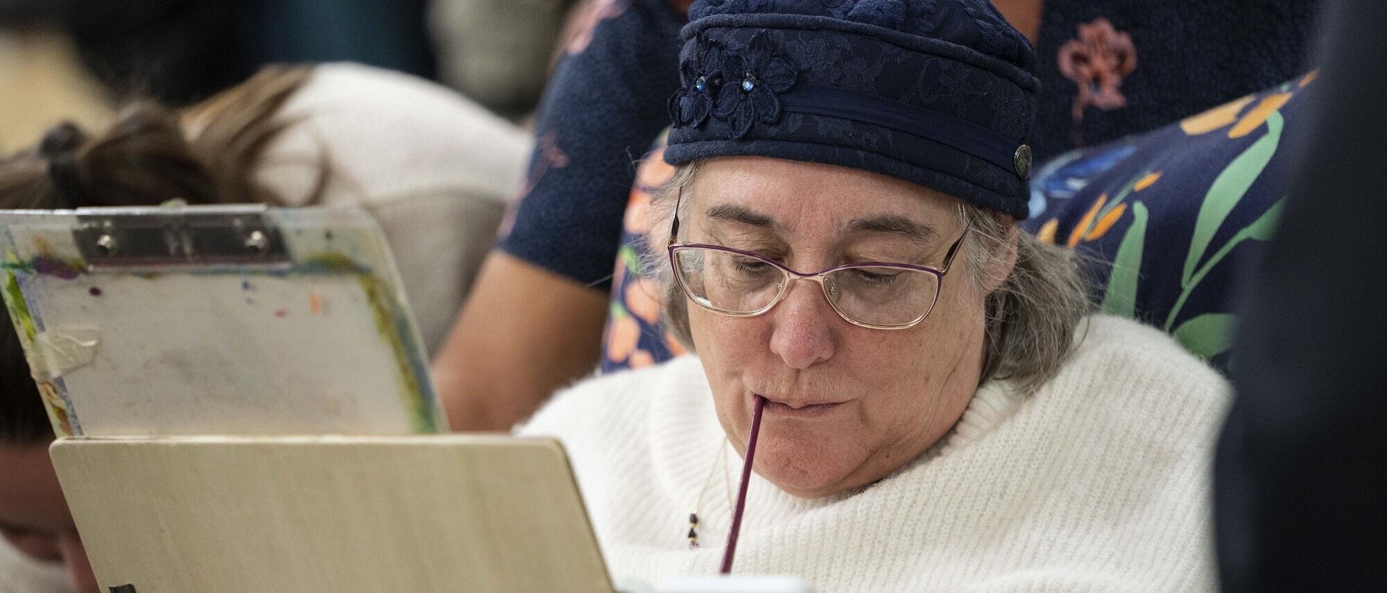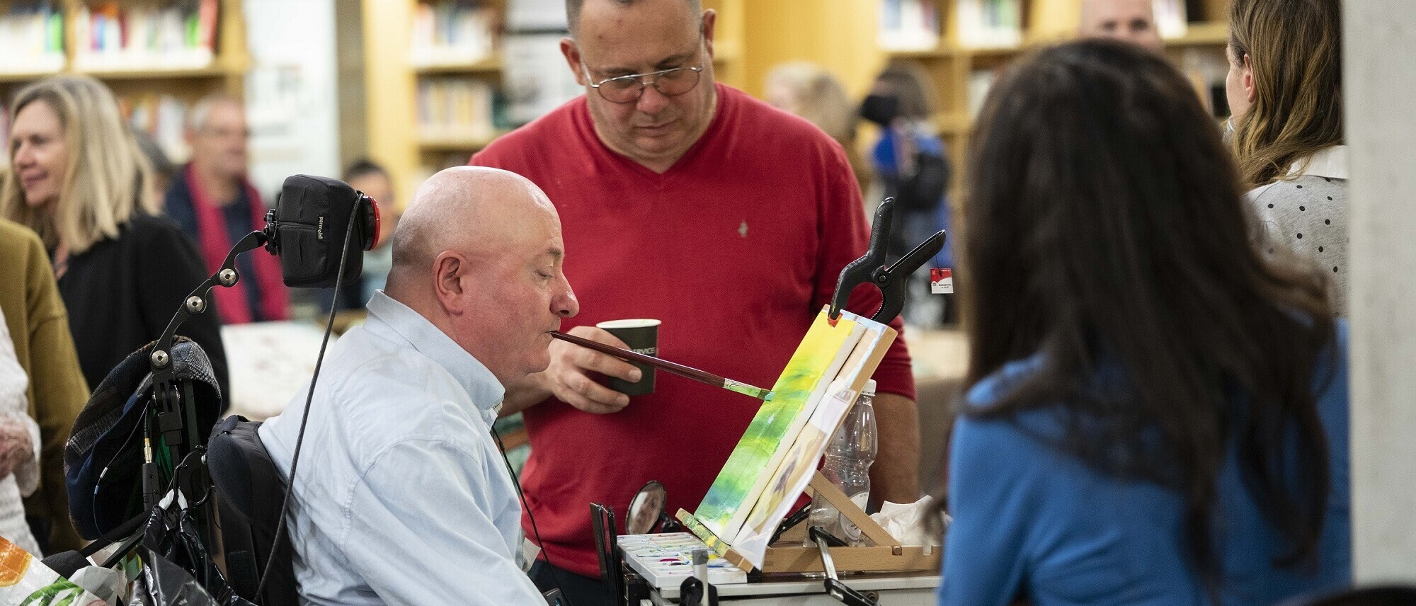 Die Mundmalerin Bracha Fischel und der Mundmaler Antoine Leisi sind Mitglieder im Kunstverlag Au, Genossenschaft der mund- oder fussmalenden Künstler (GMFK), der die ausgestellten Bilder zur Verfügung gestellt hat. Die beiden Kunstschaffenden gaben im Gespräch mit Renate Ribler spannende Einblicke in ihr Kunstschaffen. «Malen mit dem Mund ist wie Malen mit den Händen, auch wenn ich jetzt mit dem Mund um Welten besser male, als damals noch mit den Händen», erzählt Fischel schmunzelnd dem Publikum. Beim Malen unterstütze sie auch ihr Assistenzhund Donna, der an diesem Abend schlafend neben ihrem Rollstuhl lag. Anders als Bracha Fischel hatte Antoine Leisi vor seinem Unfall, der ihn zum Tetraplegiker machte, mit Kunst gar nichts am Hut. Auf die Frage, was ihn inspiriere, sagt Leisi: «Ich denke nicht viel, ich mache einfach.» Wie die Beiden mit dem Mund malen, durfte das Publikum anschliessend in einer «Malkostprobe» miterleben.