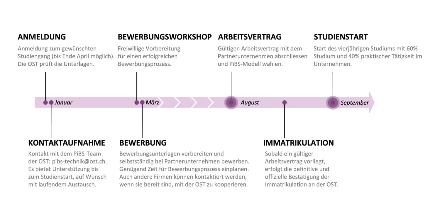 Haben Sie eine gymnasiale Matura, einen nicht studiumsverwandten Lehrabschluss mit Berufsmatura oder einen anerkannten ausländischen Abschluss und möchten an der Fachhochschule studieren? Mit dem praxisintegrierten Bachelorstudium (PiBS) können Sie ohne vorgängiges Praktikum direkt an der OST starten und von einem geregelten Lohn, persönlicher Betreuung und hervorragenden Karriereperspektiven profitieren.