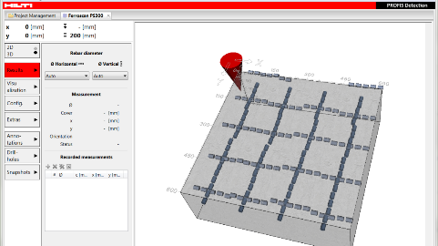 - Die Bestimmung von Durchmesser konnte durch einen globalen Ansatz, der auch die Einflüsse der Quer- und Schrägeisen berücksichtigt, im Imagescan-Modus deutlich verbessert werden. Bisher war es nur möglich, genau senkrecht zur Scanrichtung ausgerichtete Armierungseisen korrekt zu schätzen. Nun ist es möglich, beliebig geneigte Eisen korrekt zu schätzen.