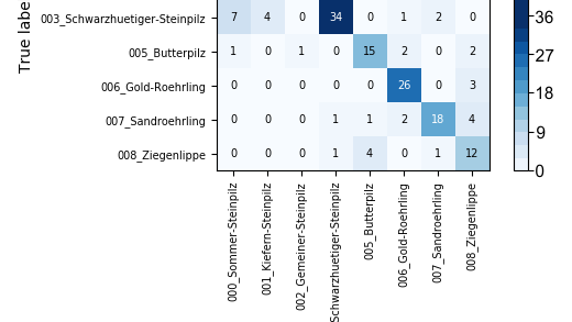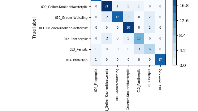Nach der Trainingsperiode lag die Trefferquote bei den Lamellenpilzen bei 85.2 % und bei den Röhrlingen 75.0 %, was als ein gutes Ergebnis eingestuft werden kann. Dank der Konfusionsmatrix konnten die Probleme bei der Klassifizierung sehr gut aufgezeigt werden. Da vier verschiedene Steinpilzarten klassifiziert werden können, die sich sehr ähnlich sind, kam es bei den Röhrlingen häufiger zu Fehlklassifizierungen als bei den Lamellenpilzen. Zudem konnten dank dem TensorBoard die Probleme des Übertrainings sehr gut visualisiert werden. Dies war der Fall, weil die Anzahl an Parametern in den neuronalen Netzen um einiges höher ist als die Anzahl zur Verfügung stehender Trainingsbilder.