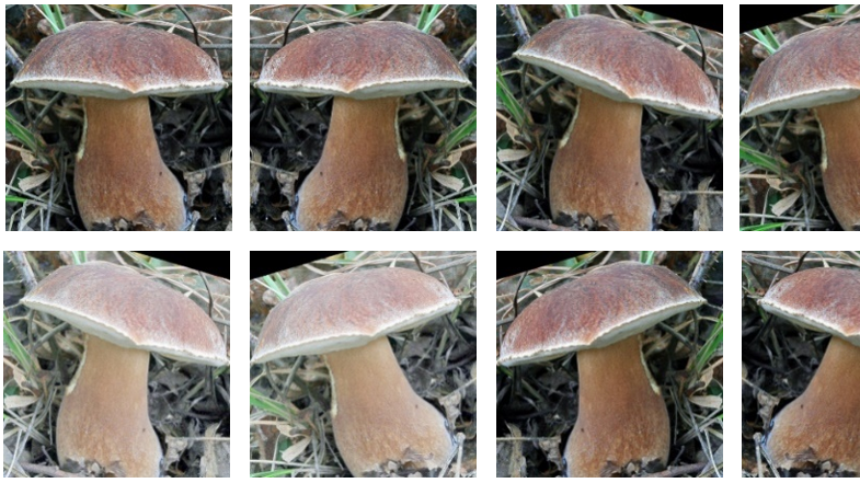 Die Basis für das Training der neuronalen Netze sind die Trainingsbilder. Es wurden tausende Bilder von verschiedenen Pilzarten aus dem Internet heruntergeladen und standardisiert. Das bedeutet, dass die Pilze in jedem Bild mithilfe von Haar-Merkmalen[3-5] lokalisiert wurden. Anschliessend wurden diese Bilder zentriert, zugeschnitten und auf eine einheitliche Grösse von 256x256 Pixel gebracht. Damit die Anzahl an Bildern möglichst gross ist, wurden anschliessend alle Bilder vervielfacht. Dies gelang durch das Spiegeln, Drehen und durch die Anpassung des Gammawertes jedes einzelnen Bildes. Durch die Kombination dieser Methoden konnten aus jedem Bild zwölf Trainingsbilder erzeugt werden. Die gesamte Anzahl an Bildern der 15 Pilzarten stieg damit auf ca. 35’000 Stück.