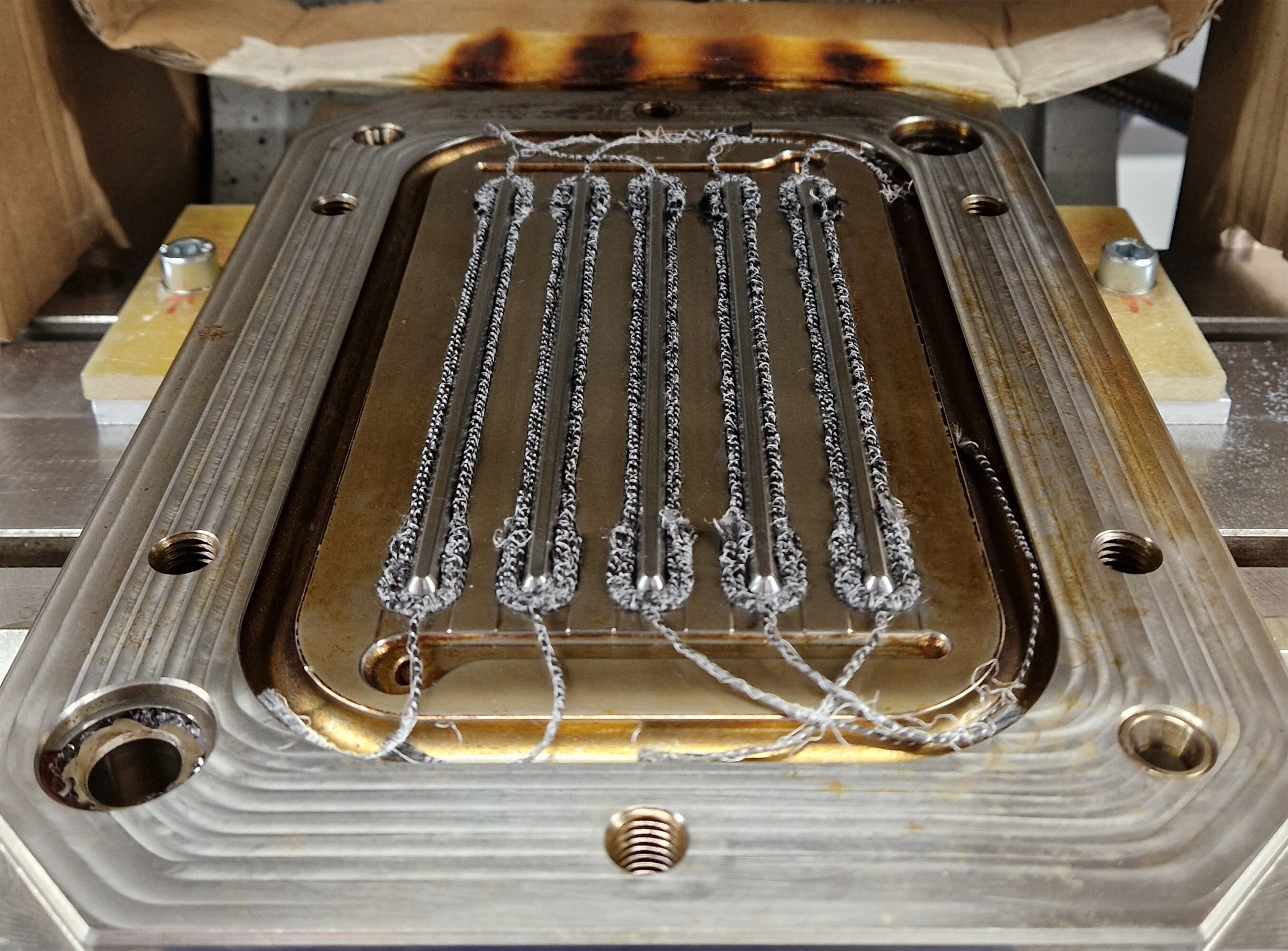 Auf Basis eines bestehenden Bauteils und der zugehörigen Form wurden experimentelle Untersuchungen bzgl. der Verarbeitung und resultierenden Bauteilqualität durchgeführt. Dabei wurde auf die Formteiltoleranzen, den Füllgrad und die Oberflächenqualität geachtet, um Rückschlüsse auf die Anforderungen für den sogenannten Stickling (Halbzeug aus dem TFP-Prozess) zu ziehen und Verbesserungsmassnahmen festzulegen.