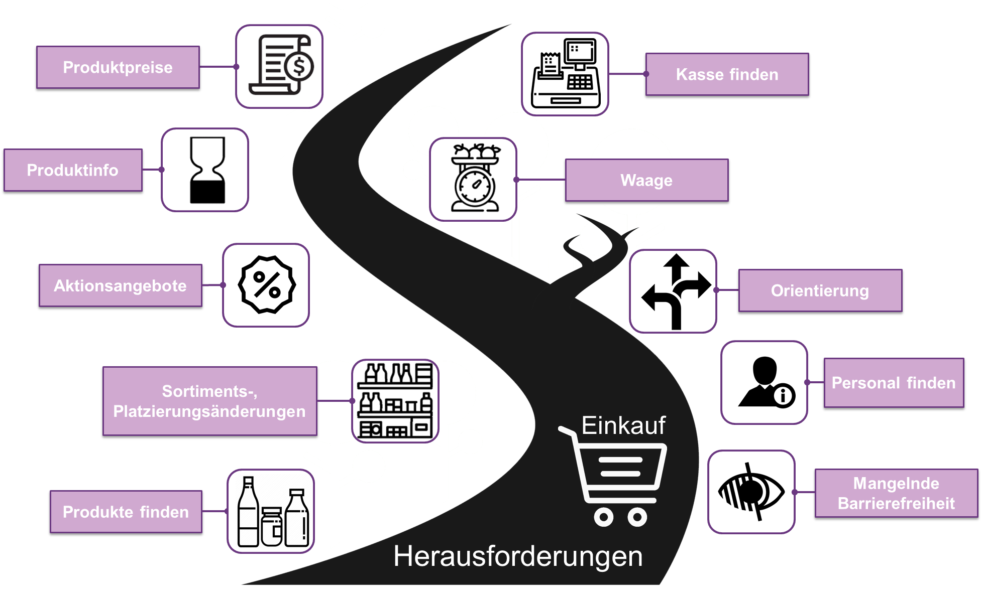 Die Anforderungen an einen Einkaufswagen für blinde und sehbehinderte Personen definieren sich aus den Herausforderungen, mit denen die Betroffenen konfrontiert sind. Die wichtigste und zugleich anspruchsvollste Hürde beim Einkaufen ohne fremde Hilfe ist das Auffinden der Produkte im Regal. Insbesondere bei Änderungen des Sortiments und der Produktplatzierung haben die Betroffenen erhebliche Schwierigkeiten, das gewünschte Produkt zu finden. Zusätzlich erschwert die ungleichmässige Beleuchtung in Supermärkten die Orientierung.