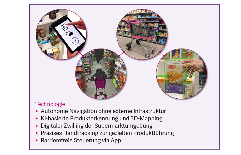 Die Stereokameras am Wagen dienen dabei nicht nur der dreidimensionalen Kartierung des Supermarkts, sie identifiziert auch die Produkte sowie die Hand des Benutzers, der Benutzerin und leitet durch akustische Anweisungen zum gewünschten Produkt. Für die Erkennung des gesuchten Produkts wird künstliche Intelligenz eingesetzt. Durch diesen innovativen Ansatz ist es nicht notwendig, den Barcode des Produkts zu scannen. Die Produkte werden unabhängig von ihrer Ausrichtung im Regal zuverlässig detektiert. Sollte ein Regal leer sein, wird die Kundin, der Kunde informiert.