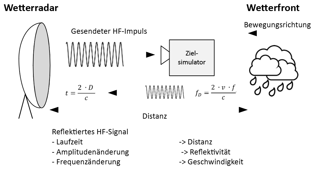 Der vom Radar gesendete hochfrequente Impuls wird von dem Zielsimulator empfangen und in ein niederfrequentes Signal umgesetzt. Mit Hilfe eines «software defined radio» (SDR) werden die interessierenden Signalparamter wie Amplitude, Frequenz und Zeitverzögerung bewusst manipuliert. Anschliessend wird das Signal wieder auf die höhere Frequenz umgesetzt und zum Wetterradar zurückgesendet. Damit lässt sich ein virtuelles Objekt mit definierten Eigenschaften simulieren.