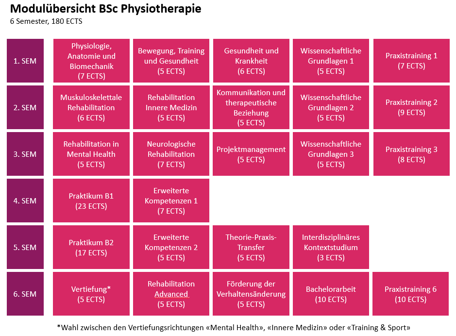 In diesem Pflichtmodul entwickeln Sie ein vertieftes Verständnis für die Relevanz der Wechselwirkung zwischen körperlicher Aktivität und dem Heilungsprozess in unterschiedlichen Settings der stationären Rehabilitation. Sie erarbeiten im Rahmen einer Projektarbeit Konzepte zur Förderung von körperlicher Aktivität und Training in der Rehabilitation. Zusätzlich werden die Kompetenzen der Physiotherapie im Bereich der Rehabilitation nach Krebserkrankungen erarbeitet.