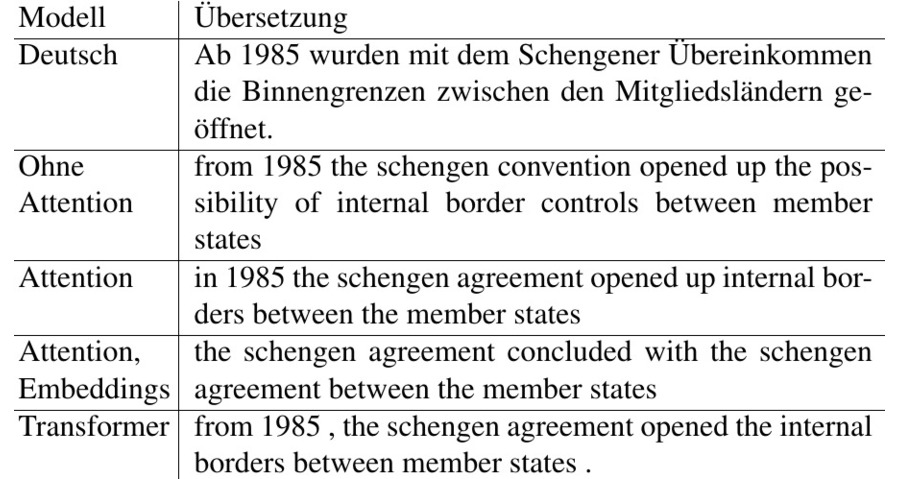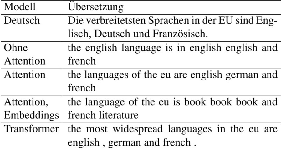 Ergebnis: Die Übersetzung mit Attention ist bedeutend besser als ohne Attention. Die Semantik innerhalb eines Satzes wird besser erfasst und Details werden viel besser in die Zielsprache übersetzt. Die vortrainierten Embeddings haben die Übersetzung verschlechtert. Das Modell mit Attention und der Transformer liefern bei eher einfachen Sätzen meist gute Übersetzungen.