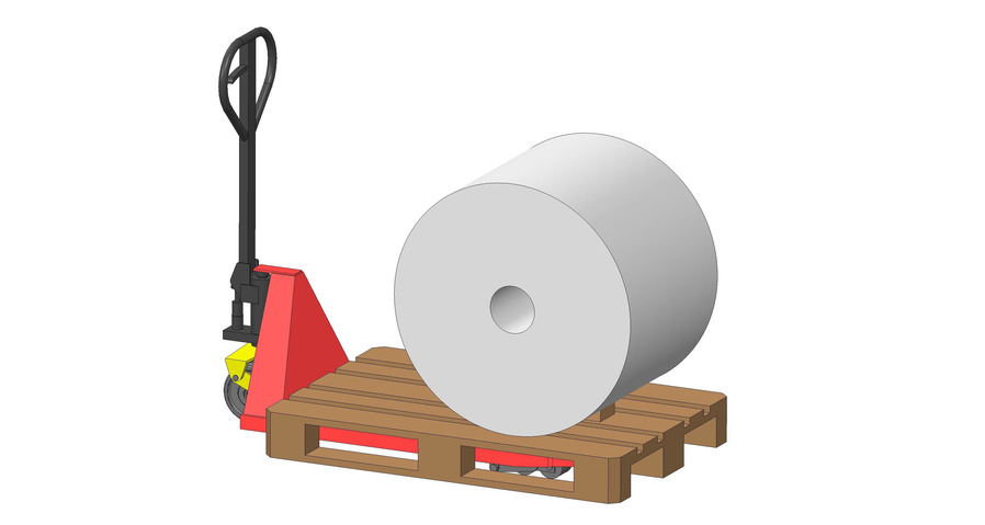 Aufgabenstellung: Beim Materialwechsel werden Rollen mit bis zu 960 kg Gewicht und 1000 mm Durchmesser präzise in die Maschine eingeführt. Bislang wird der Prozess manuell mithilfe eines Scherenhubwagens durchgeführt. Der Prozess verlangt Kraft beim bedienenden Personal und führt zu einem Maschinenstillstand.