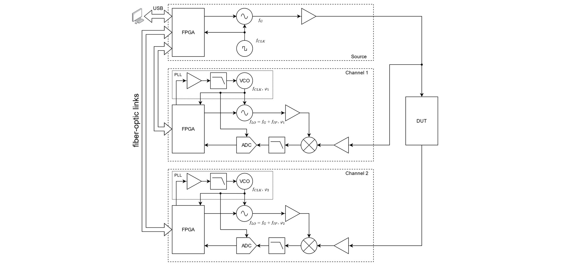 Einleitung: Vektorielle Netzwerkanalysatoren werden in erster Linie zur Messung von Netzwerkparametern, beispielsweise S-Parameter, von elektrischen Schaltungen verwendet. Diese Parameter werden zur Charakterisierung von elektrischen Netzwerken wie beispielsweise Filtern, Verstärkern und mehr verwendet. Ein Nachteil der meisten handelsüblichen Vektor-Netzwerkanalysatoren ist, dass alle Ein- und Ausgänge auf ein gemeinsames Massepotential bezogen sind, was den Einsatz bei Messungen erschwert, bei denen eine galvanische Isolation erforderlich ist. Um dieses Problem zu überwinden, wurde in dieser Arbeit ein Konzept für einen galvanisch isolierten Vektor-Netzwerkanalysator entwickelt. Das System soll aus drei separaten Einheiten bestehen, die vollständig galvanisch voneinander isoliert sind. Zwei Einheiten sind dedizierte Messkanäle, die dritte Einheit dient als Basis mit Signalquelle. Die Kommunikation zwischen den Einheiten erfolgt über optische Fasern. Der Schwerpunkt lag auf dem erreichbaren Phasenfehler des Messsystems, der vollständig von der Synchronität der Messkanäle zueinander abhängig ist. Die Anforderungen sind mit einem Phasenfehler von 0.5° bei 50 MHz vorgegeben, was einer Zeitverzögerung von 27.8 ps entspricht.