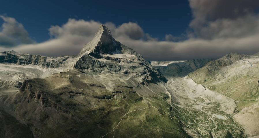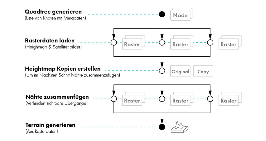 Bei der fotorealistischen Darstellung werden Daten, wie Höhendaten und Satellitenbilder abhängig von einer angegebenen Koordinate abschnittweise in verschiedenen Auflösungen (je weiter entfernt vom Betrachter, desto weniger hochauflösend) geladen und zu einem Terrain zusammengefügt (Abb. Oben). Ausserdem können Gebäudemodelle und verschiedenste Overlays generiert werden (Abb. Mitte). Für den Fotorealismus wird mithilfe von Unity eine echtzeitfähige Simulation der Beleuchtung und Atmosphäre, inklusive Wolken, etc. umgesetzt (Abb. Unten).
