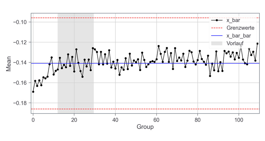Um die zuvor berechneten Faktoren zu überwachen, kann statistische Prozesskontrolle eingesetzt werden. In Abbildung 2 wird jeweils der Mittelwert von zehn Messungen überwacht.
