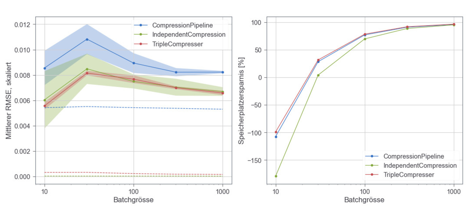 Ergebnis: Mit den beschriebenen Methoden wird erreicht, dass bei grossen Rohdatenmengen über 95% des Speicherplatzes eingespart werden kann. Wenn die Amplitude der zu komprimierenden Variable 100% darstellt, kann der mittlere Rekonstruktionsfehler bis auf 0,5% reduziert werden. Der Zusammenhang zwischen Batchgrösse und Rekonstruktionsfehler sowie Speicherersparnis ist in Abbildung 3 dargestellt. Dabei wird zwischen den drei beschriebenen Ansätzen unterschieden.