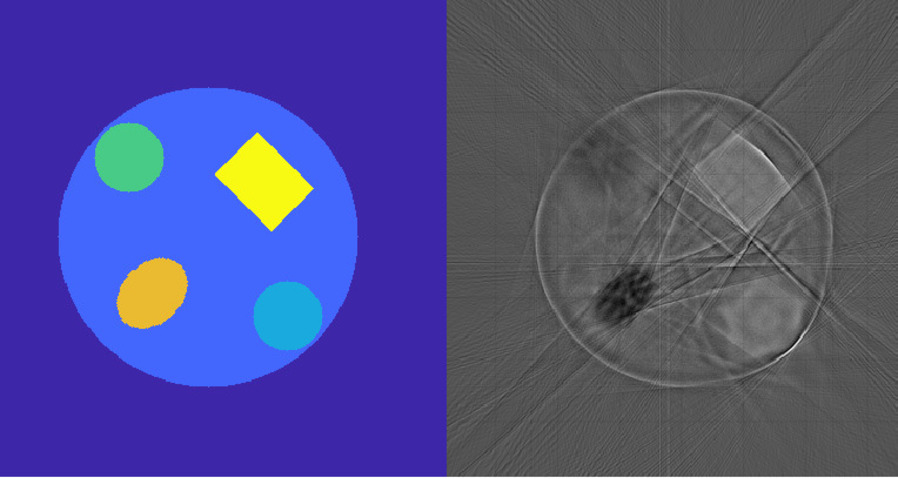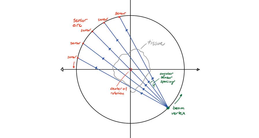 Um einer realen Anwendung so nahe wie möglich zu kommen, wird die Fächerstrahlmethode verwendet. Die Methode basiert auf einer Strahlenquelle, dem Ultraschallwandler, der um das Gewebe rotiert und einen Fächerstrahl durch das Medium sendet. Die Signale werden dann auf einem Sensorbogen aufgezeichnet. Die aufgezeichneten Signale ermöglichen die Berechnung von Signalamplituden und Laufzeiten des Signals, woraus wiederum ein so genanntes Sinogramm erzeugt werden kann. Die inverse Radon-Transformation, implementiert als Matlab-Funktion ifanbeam, wird dann zur Rekonstruktion der Bilder verwendet.