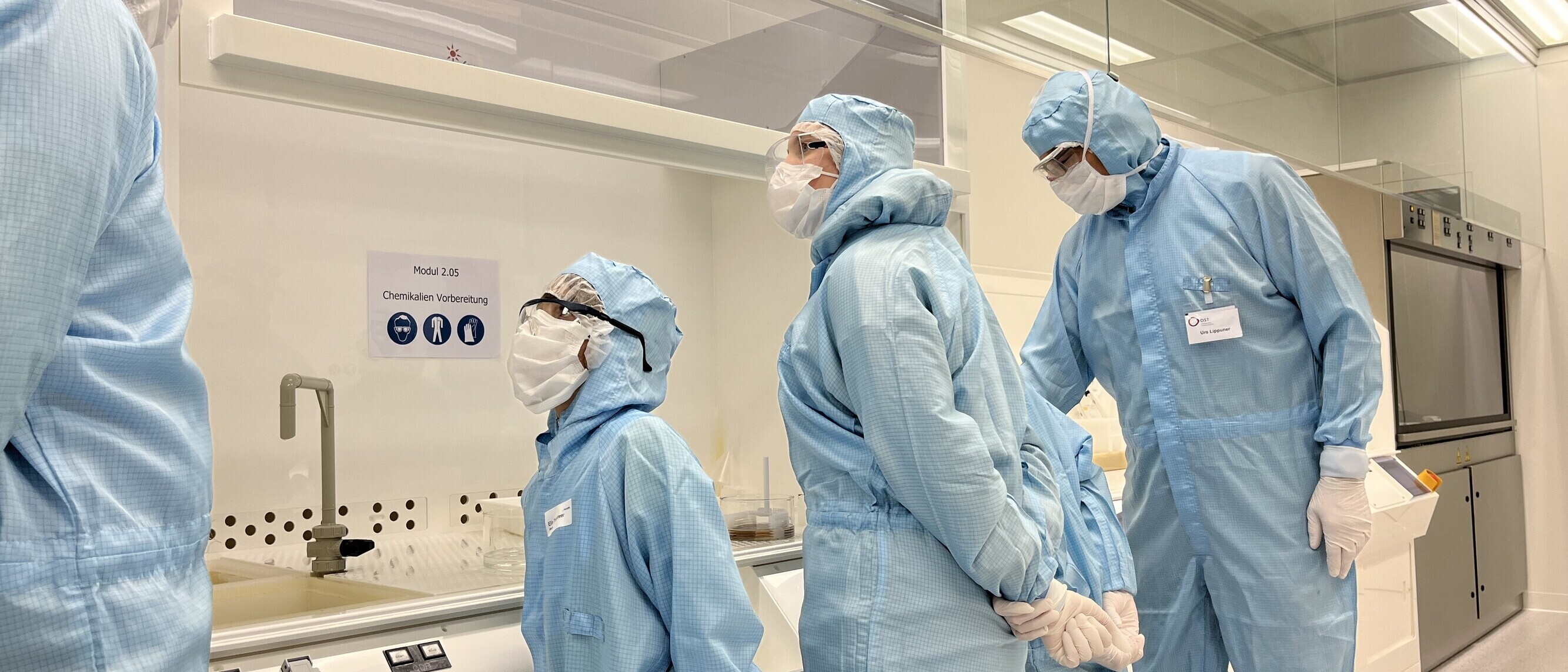 - Du bekommst die einmalige Gelegenheit, in einem echten Hightech-Reinraum selbst mikrotechnische Prozesse wie Fotolithographie, Ätzen und Reinigen durchzuführen.