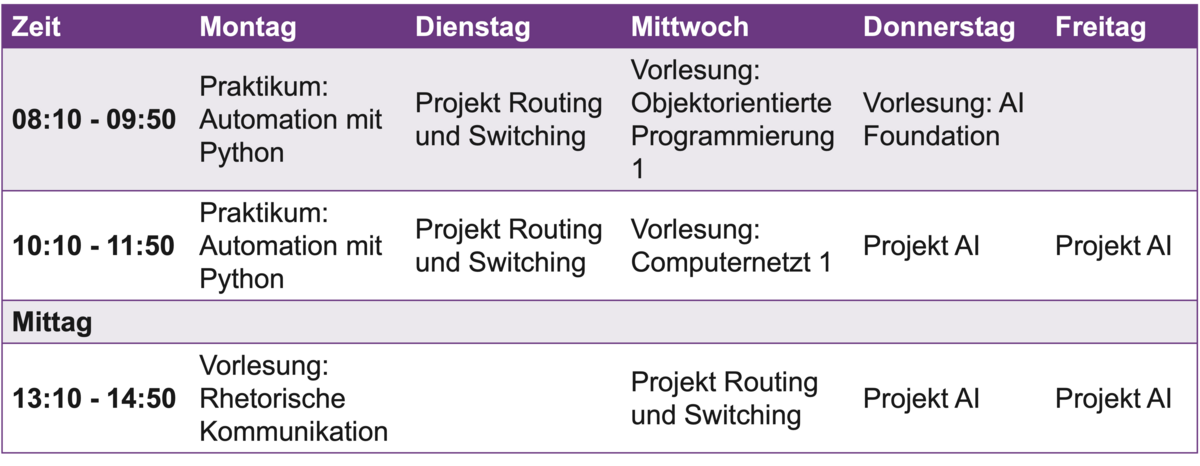 - Du besuchst Vorlesungen (AI Foundations, Automatisierung mit Python, Computernetze 1, und Objektorientierte Programmierung 1 ) zusammen mit den Studierenden aus dem Studiengang Informatik