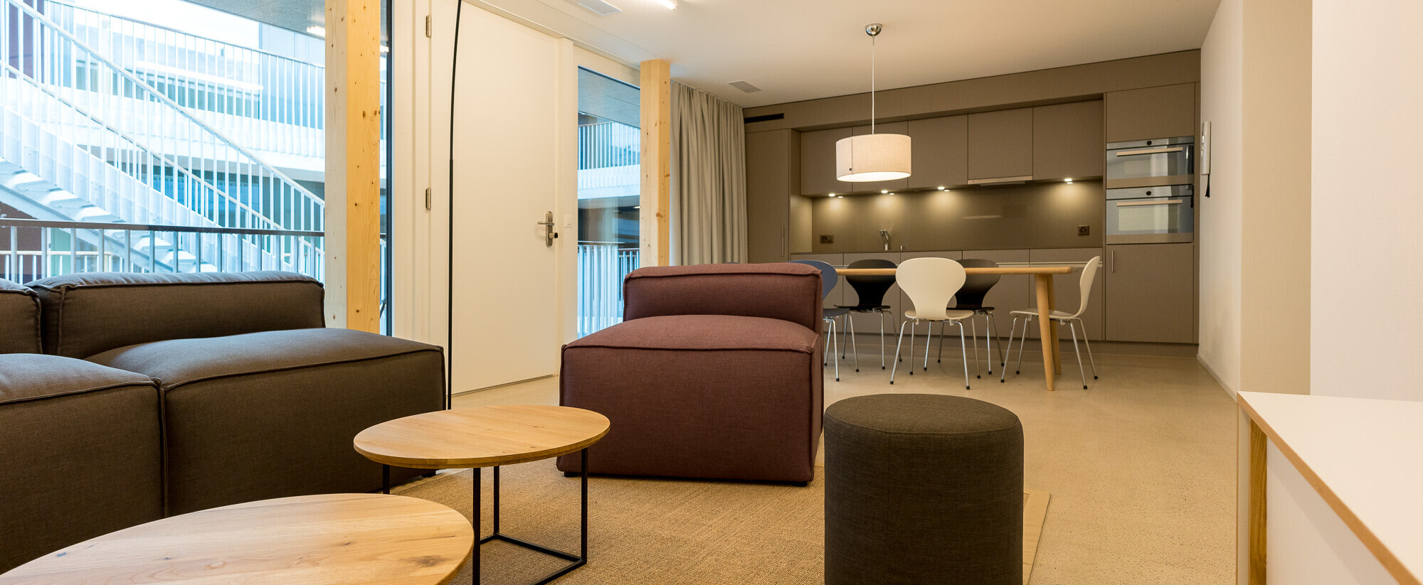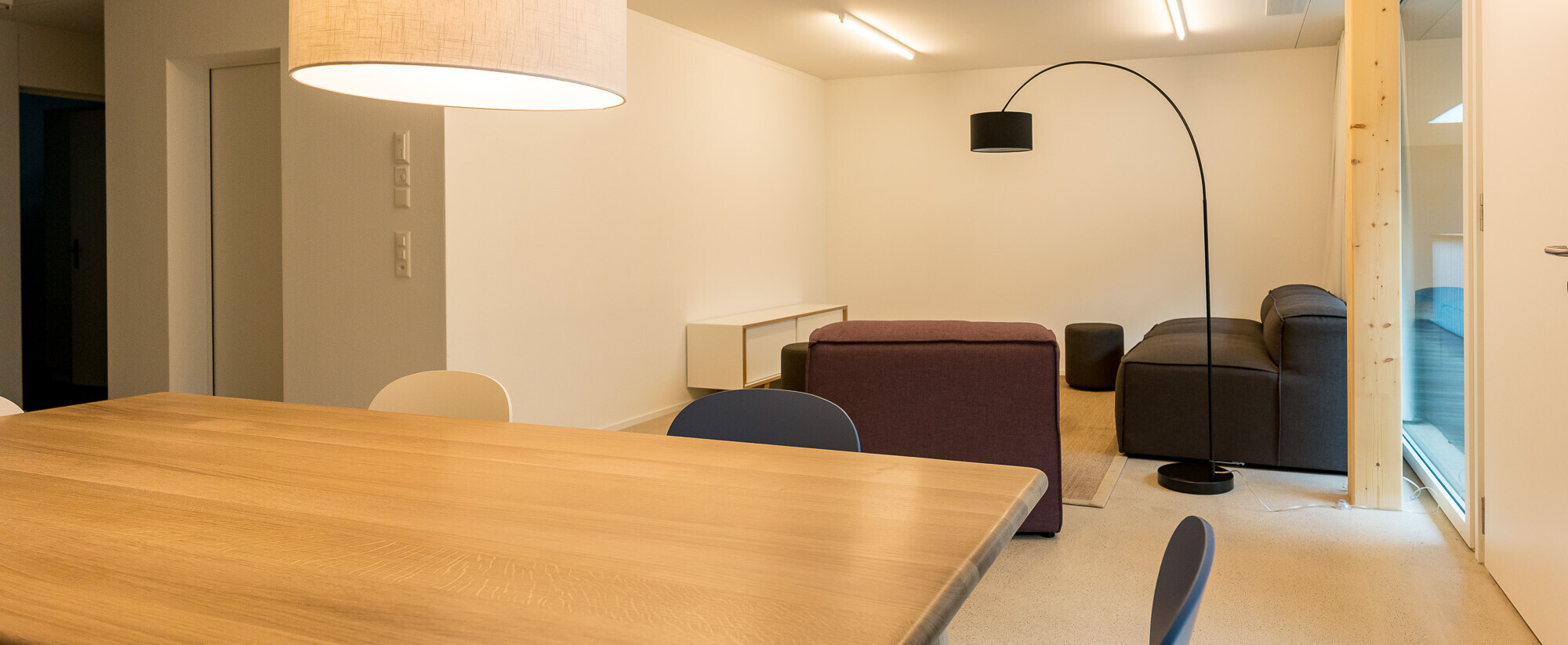 Im Erdgeschoss des Studentenwohnheims befinden sich die sieben Studios mit separater Nasszelle und gemeinsamer Küche sowie drei 3-er Wohngruppen.