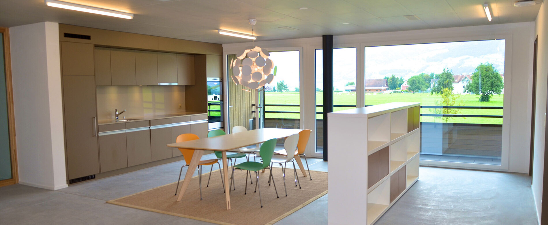 Jede Wohngruppe hat einen eigenen Balkon und eine grosszügige Küche mit Aufenthaltsbereich. Die Nasszellen in den Wohngruppen mit Dusche und Toilette teilen sich jeweils zwei bis drei Personen.