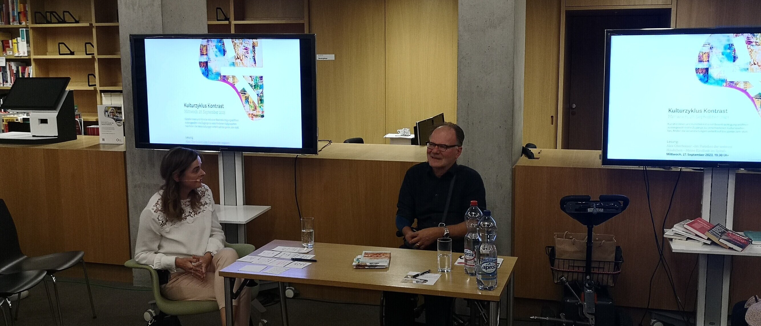 Daniel Seelhofer, Rektor der OST, begrüsste die rund 50 Gäste die sich zur bereits neunten Durchführung des Kulturzyklus Kontrast an der OST am Standort St.Gallen eingefunden haben. "Der Kulturzyklus bietet die Gelegenheit, Werke von Künstlerinnen und Künstlern mit Beeinträchtigungen sichtbarer zu machen", sagte er eingangs. Stefan Ribler, Projektleiter des Kulturzyklus Kontrast und Dozent in der Lehre Departement Soziale Arbeit, erklärte in seiner Einführung das neue System des Kulturzyklus. Die Veranstaltungen finden neu nicht mehr in einer Woche statt, sondern werden im Rahmen einer Weiterentwicklung auf einzelne Anlässe im Jahr aufgeteilt. Der nächste Termin soll im November stattfinden und baldmöglichst kommuniziert werden. Nach einem kurzen Rückblick auf zehn Jahre Kulturzyklus stieg Projektgruppenmitglied Renate Ribler, Primarlehrerin, direkt in die Diskussion mit Alex Oberholzer ein.