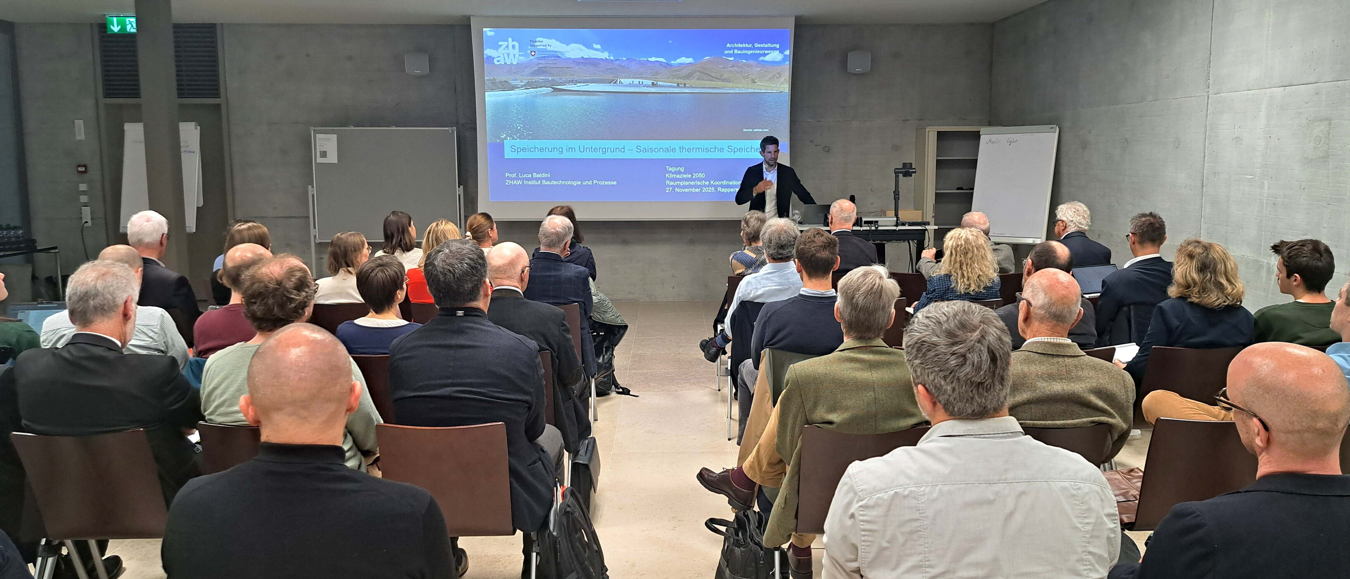 «Klimaziele 2050 – Raumplanerische Koordination im Untergrund» lautete das Thema der Fachtagung, die der FRU (Fachkreis Raumplanung im Untergrund) am Donnerstag, 27. November 2025 an der OST in Rapperswil durchführte. Eröffnet wurde der inhaltliche Teil von Gastgeber Prof. Andreas Schneider vom IRAP mit dem ersten Referat. Schneider gab den rund 50 Teilnehmenden einen kurzen Einstieg ins Thema und erklärte, warum raumplanerische Koordination im Untergrund bisher oft nur punktuell erfolgte, was in Zukunft ein Problem sein könnte. Denn angesichts des knapper werdenden Platzes an der Oberfläche wachse das Interesse an einer Nutzung des Untergrunds. Insbesondere im Bereich Energienutzung und -transport entstehen infolge der Klimaziele 2050 neue Ansprüche an den unterirdischen Raum.