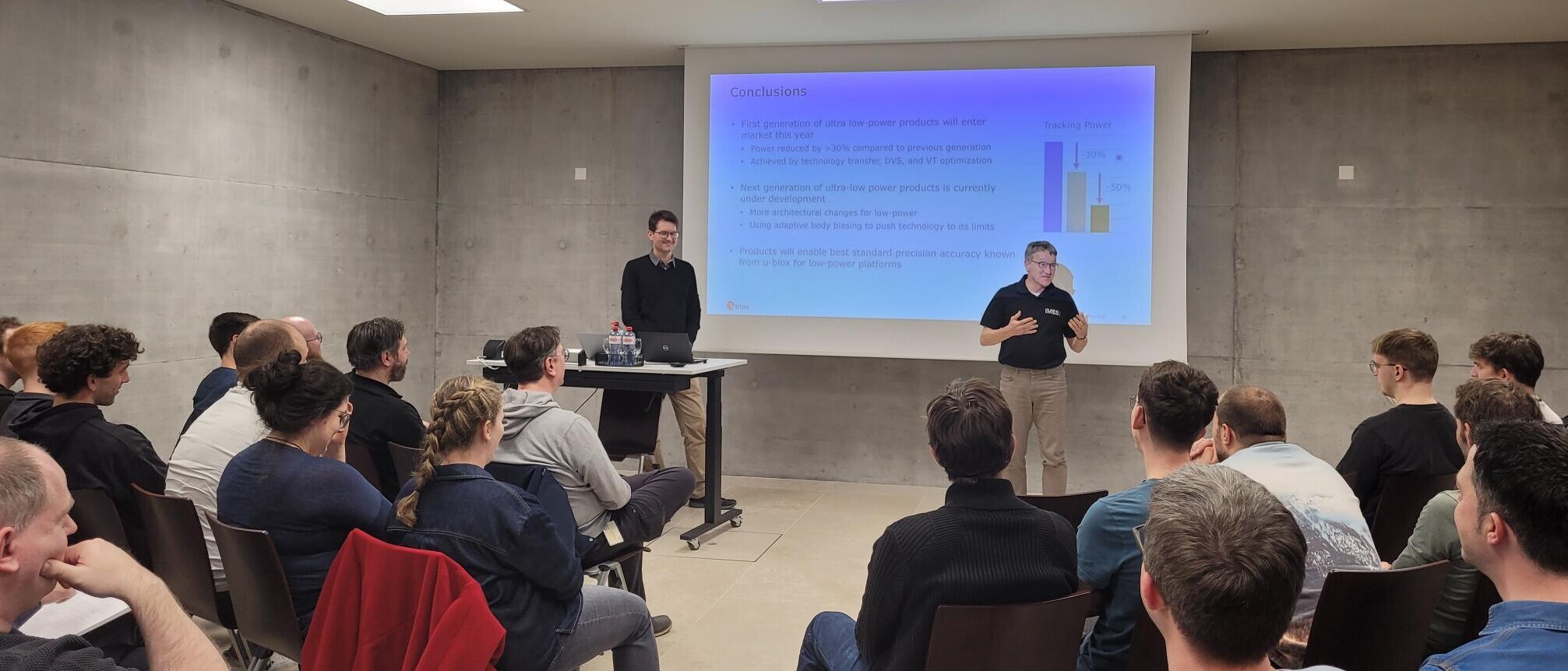 Anschliessend nahm Patrick Mächler von der Firma u-blox AG den roten Faden auf und widmete sich in seiner Präsentation dem Low-Power Chipdesign im Bereich der Satellitennavigationssysteme. Das Schweizer Unternehmen mit Hauptsitz in Thalwil ist heute weltweit tätig und entwickelt Chips und Module für Satellitennavigation, Bluetooth, Wi-Fi und verwandte Technologien - sowohl für Privatkunden als auch für industrielle und autonome Anwendungen.