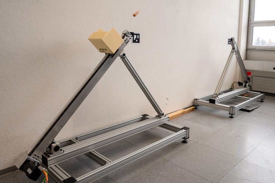 Zwei Rampen, auf der einen Seite ein Konus, auf der anderen ein Fangbehälter: Was simpel aussieht, ist die Basis für eine Innovation: In 20 Sekunden wirft der Throwbot sechs rohe Eier 3,5 Meter weit durch die Luft, die Resultate der ersten Tests sind vielversprechend – Videos davon gibt es hier und hier zu sehen. «Wenn Gegenstände durch die Luft transportiert werden könnten, gäbe es keine Förderbänder mehr, welche die Produktionsstrassen limitieren», erklärt Jonas Frei, Projektleiter und Wissenschaftlicher Mitarbeiter am EMS, Institut für Entwicklung Mechatronischer Systeme am OST-Standort Buchs.