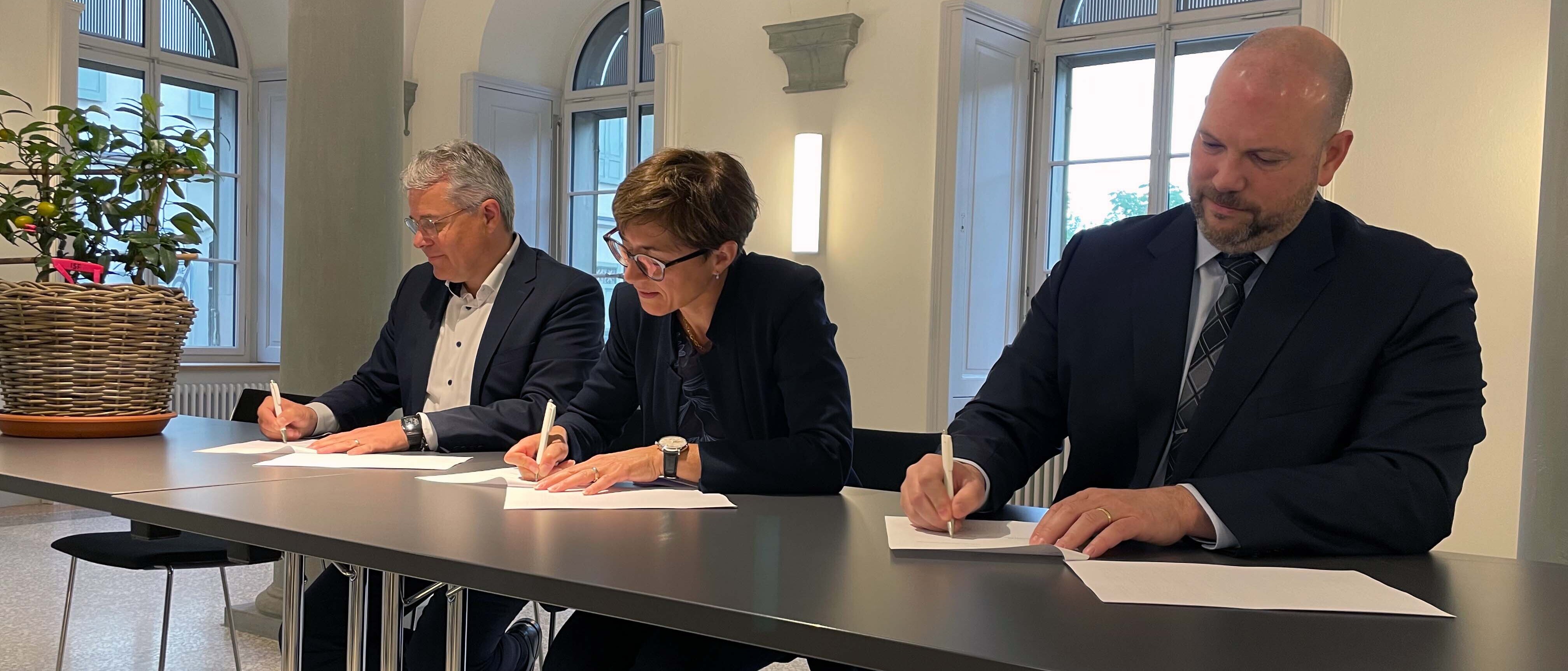 Heute Montag wurde eine mehrjährige Leistungsvereinbarung zwischen dem Kanton Thurgau, vertreten durch Regierungsrätin Monika Knill, Chefin des Departementes für Erziehung und Kultur, und der OST, repräsentiert durch Rektor Prof. Dr. Daniel Seelhofer und den Leiter des Departements Technik, Prof. Dr. Knut Siercks, unterzeichnet. Die Vereinbarung regelt den Betrieb des neuen Instituts für Intelligente Systeme und Smart Farming der Land- und Ernährungswirtschaft (ISF) der OST am Standort Tänikon im Auftrag des Kantons Thurgau für die erste Phase von 2025 bis 2028. Diese Vereinbarung markiert einen entscheidenden Schritt zur nachhaltigen Förderung der Hochschulaktivitäten im Bereich der innovativen Land- und Ernährungswirtschaft im Kanton Thurgau. Die OST gründet in Tänikon ein Institut und schafft damit neue Forschungsarbeitsplätze im Kanton. «Das neue Institut der OST stärkt den interdisziplinären Forschungsstandort Tänikon und verleiht ihm zusätzliche Strahlkraft für die Schweiz und über ihre Grenzen hinaus», sagt Monika Knill. Bei der Unterzeichnung war auch Regierungsrat Walter Schönholzer, Chef des Departementes für Inneres und Volkswirtschaft, anwesend, was die Bedeutung der neuen Hochschulkooperation für den Kanton Thurgau unterstreicht.