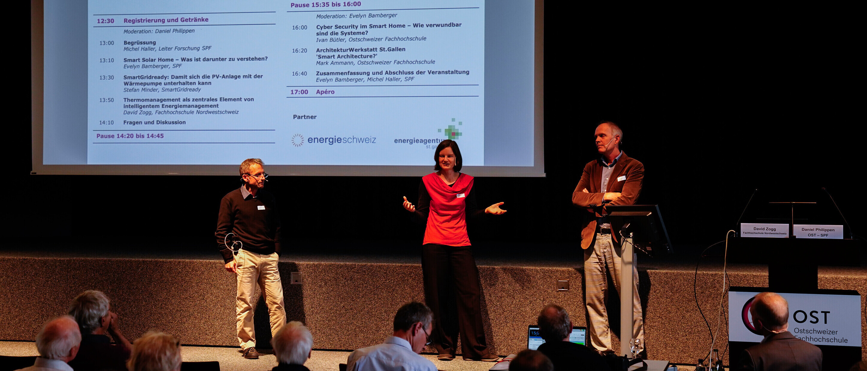 Bevor es in einzelne Teilaspekte des Smart Solar Homes ging, gab zunächst Evelyn Bamberger vom SPF einen Gesamtüberblick. Dabei spannte sie den Bogen vom Smart Home mit der Steuerung der Beleuchtung oder der Alarmanlage über das «Smart Home Energy Management System», in welchem es um die Verbrauchsmessung (Smart Metering) und darauf aufbauend die Steuerung von Stromverbrauchern geht. Im Smart Solar Home schliesslich steht die Solaranlage im Mittelpunkt der Steuerung, welche zusammen mit steuerbaren Verbrauchern wie Wärmepumpe und E-Mobil zur PV-Eigenverbrauchsoptimierung oder für einen Netznutzen eingesetzt werden kann.