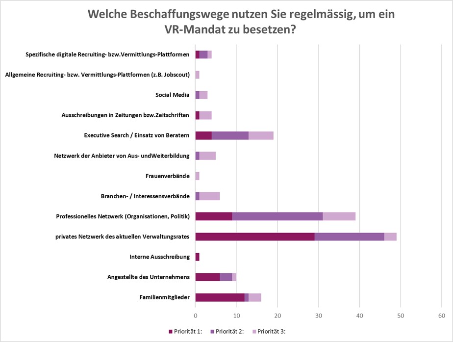 Dem privaten Netzwerk wird dabei mehr Beachtung geschenkt (über die Hälfte stuft es als Priorität 1 ein), während das professionelle Netzwerk mit über der Hälfte auf Priorität 2 steht. Daraus lässt sich ableiten, dass eine Mehrheit zuerst das private und in einem zweiten Schritt das professionelle Netzwerk angeht, wenn ein VR-Mandat neu zu besetzen ist. Zwar liegen die Familienmitglieder mit grossem Abstand auf Platz 4, auffällig ist aber, dass der Grossteil davon als Priorität 1 vergeben wurde und dabei einen höheren Wert erreicht als die Priorität 1 beim professionellen Netzwerk. Zählt man die Familienmitglieder ebenfalls zum privaten Netzwerk, verstärkt sich dessen Bedeutung noch weiter.