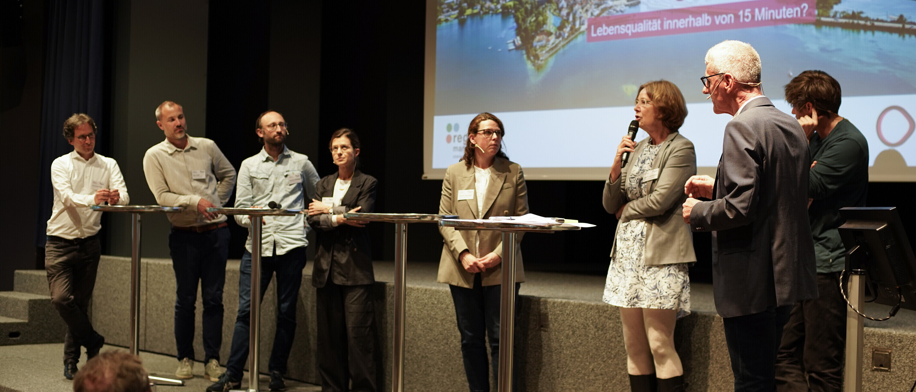 Was steht hinter dem 15 Min-Ansatz und wie sieht eine entsprechende räumliche Entwicklung aus? Dieser Frage widmete sich Tanja Herdt, Professorin für Städtebau am IRAP. Anhand konkreter Beispiele und wissenschaftlicher Untersuchungen zeigte sie die Zusammenhänge zwischen baulicher Dichte sowie der Nutzungs- und der Einwohnerdichte auf. Daraus leitete sie ab, dass die gewünschte Abstimmung von Siedlung und Mobilität ausschliesslich bei einer hohen Nutzung und einer Durchmischung von Arbeiten und Wohnen ermöglicht werde. Identität mit einem Ort entstehe insbesondere durch die Begegnung. Die voranschreitende Innentwicklung, der demographische Wandel und die notwendige Sanierung von bestimmten Siedlungstypologien könnten dazu genutzt werden, raumplanerisch lenkend zu wirken.