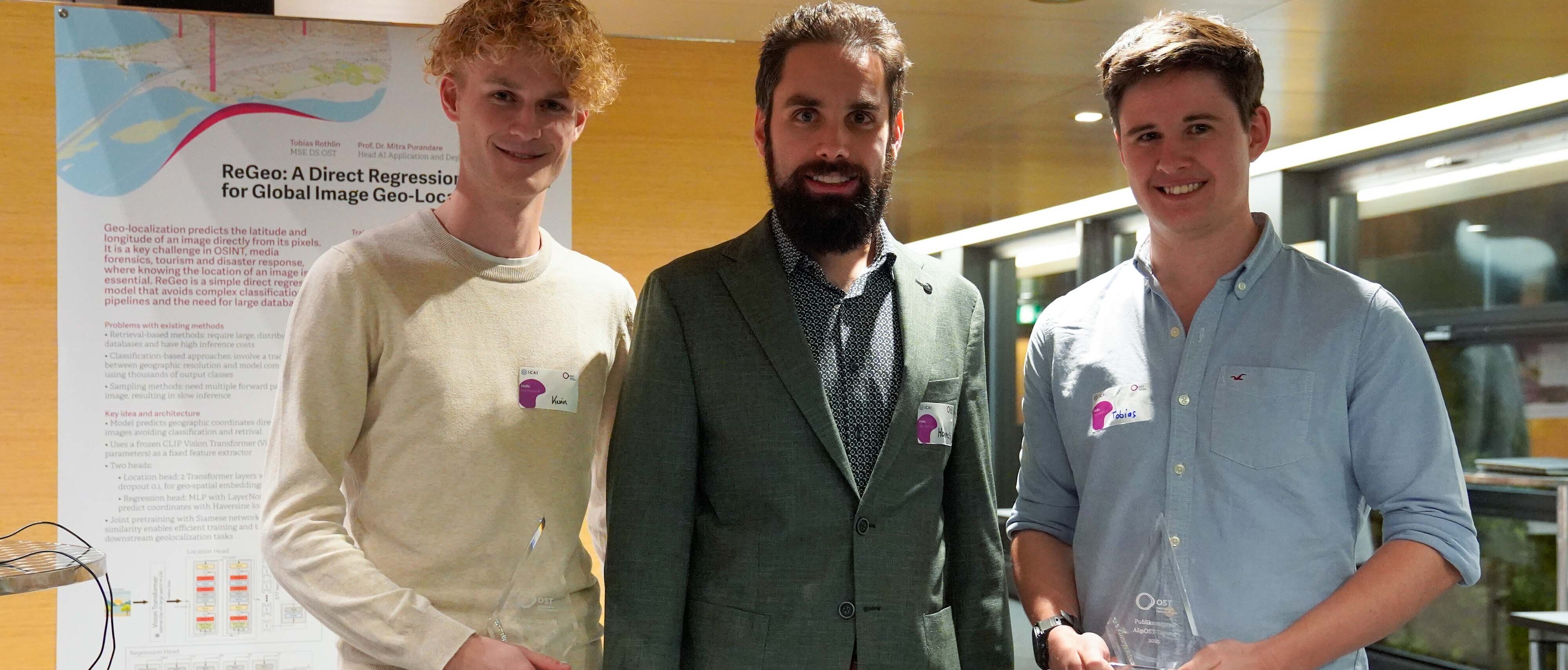 - Bild 1: Das Studentenprojekt «ReGeo» wird an der «AI@OST-Tagung» ausgezeichnet. Von li. nach re.: Kevin Löffler (IFS OST), Hannes Badertscher (Leiter a.i. ICAI OST), Tobias Rothlin (Absolvent OST)