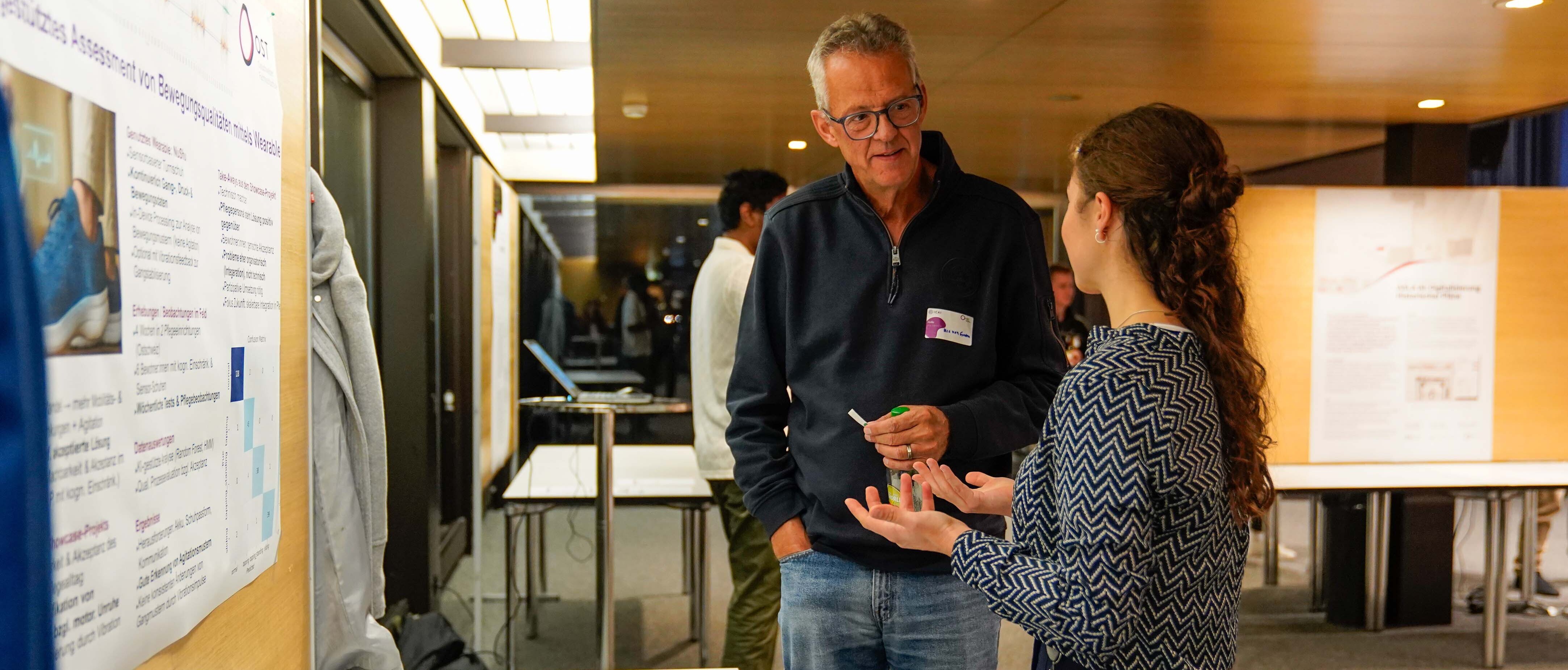 Die vorgestellten Projekte beschäftigen sich unter anderem mit den Herausforderungen des demografischen Wandels. So entwickelt eines der Projektteams einen KI-basierten Chatbot, der pflegenden Angehörigen Empfehlungen zu passenden Gesundheitsdienstleistungen in der Stadt St.Gallen gibt. Eine andere Gruppe erfasst Bewegungsdaten älterer Menschen in Pflegeinstitutionen mithilfe eines intelligenten Sensor-Schuhs. Diese Daten liefern wertvolle Hinweise darauf, wie sich die körperliche Aktivität einer Person verändert und ob sie zum Beispiel sturzgefährdet ist. In einem weiteren Projekt werden KI-Exergames für Lernende in Gesundheits- und Sozialberufen entwickelt – diese sollen ihre psychische und physische Gesundheit fördern.