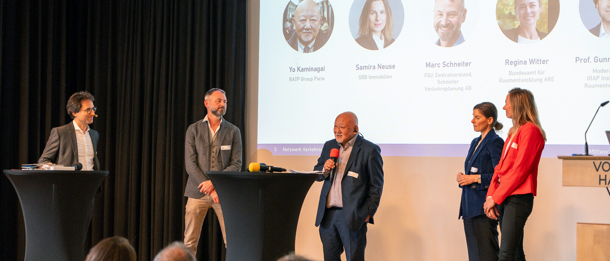 Abgerundet wurde der Nachmittag mit einer Podiumsdiskussion, bei der Yo Kaminagai (ehem. RATP Paris), Samira Neuse (SBB-Immobilien), Marc Schneiter (FSU Fachverband Schweizer Raumplaner) und Regina Witter (Bundesamt für Raumentwicklung ARE) gemeinsam die wich- tigsten Fragen und Erkenntnisse des Tages besprachen.