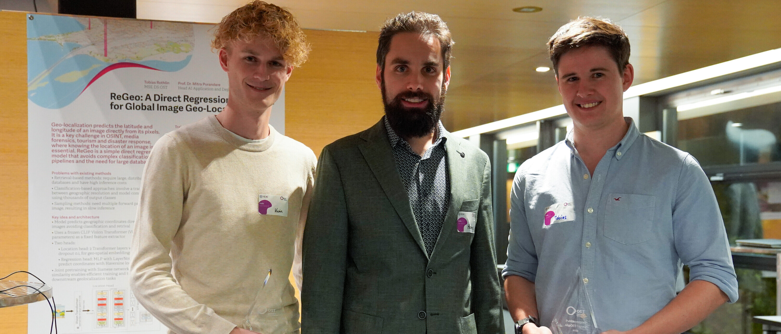 An der diesjährigen «AI@OST-Tagung» wurden 20 Projekte präsentiert, die eindrücklich aufzeigten, wie vielseitig Künstliche Intelligenz heute zur Bewältigung gesellschaftlicher Herausforderungen eingesetzt werden kann. Besonders überzeugen konnte das Studentenprojekt «ReGeo», das vom Publikum zum Siegerprojekt gewählt wurde. Entwickelt von Kevin Löffler und Tobias Rothlin am IFS Institut für Software, vereinfacht das Modell die Geolokalisierung mithilfe KI-basierter Ansätze.